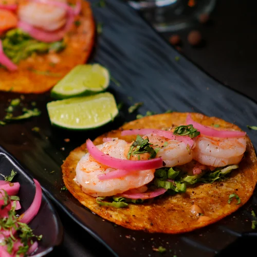 Tortilla de maíz dorada, camarones salteado en mantequilla de ajo y perejil, lechuga, cilantro, cebolla acevichada y mayonesa chipotle.