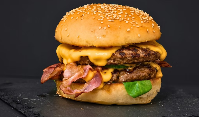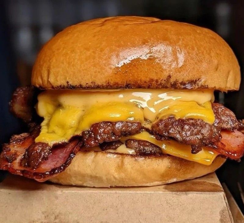Hamburguesa con doble carne de res cada una de 120gr, doble tocineta, doble queso mozarella, lechuga, tomate, cebolla caramelizada, salsas de la casa, Incluye 100gr de papas a la francesa