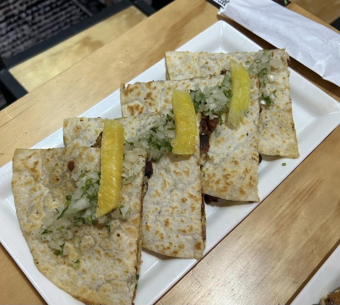 Tortilla de harina grande, queso mozarella, piña, cebolla y cilantro, carne al pastor.