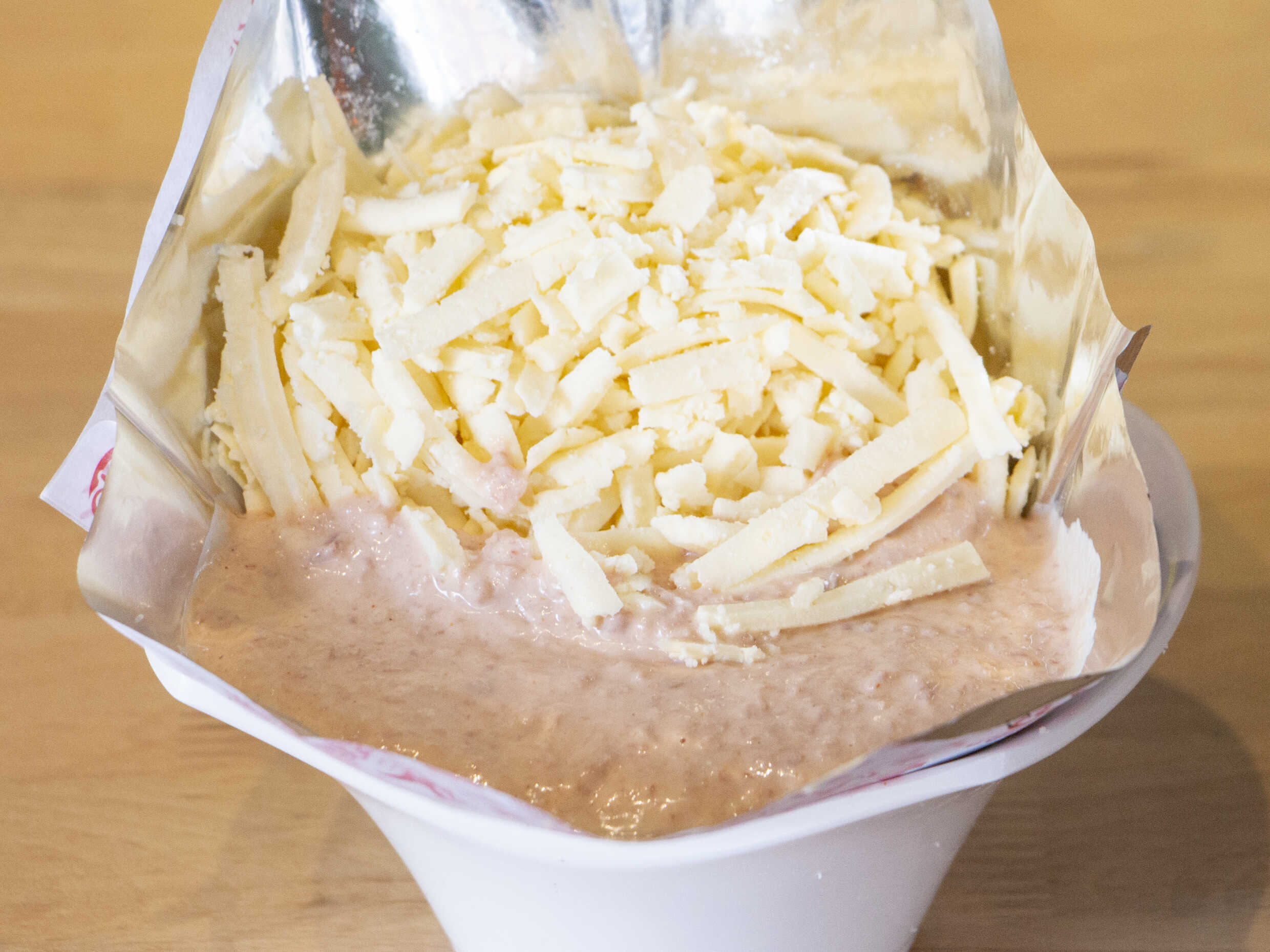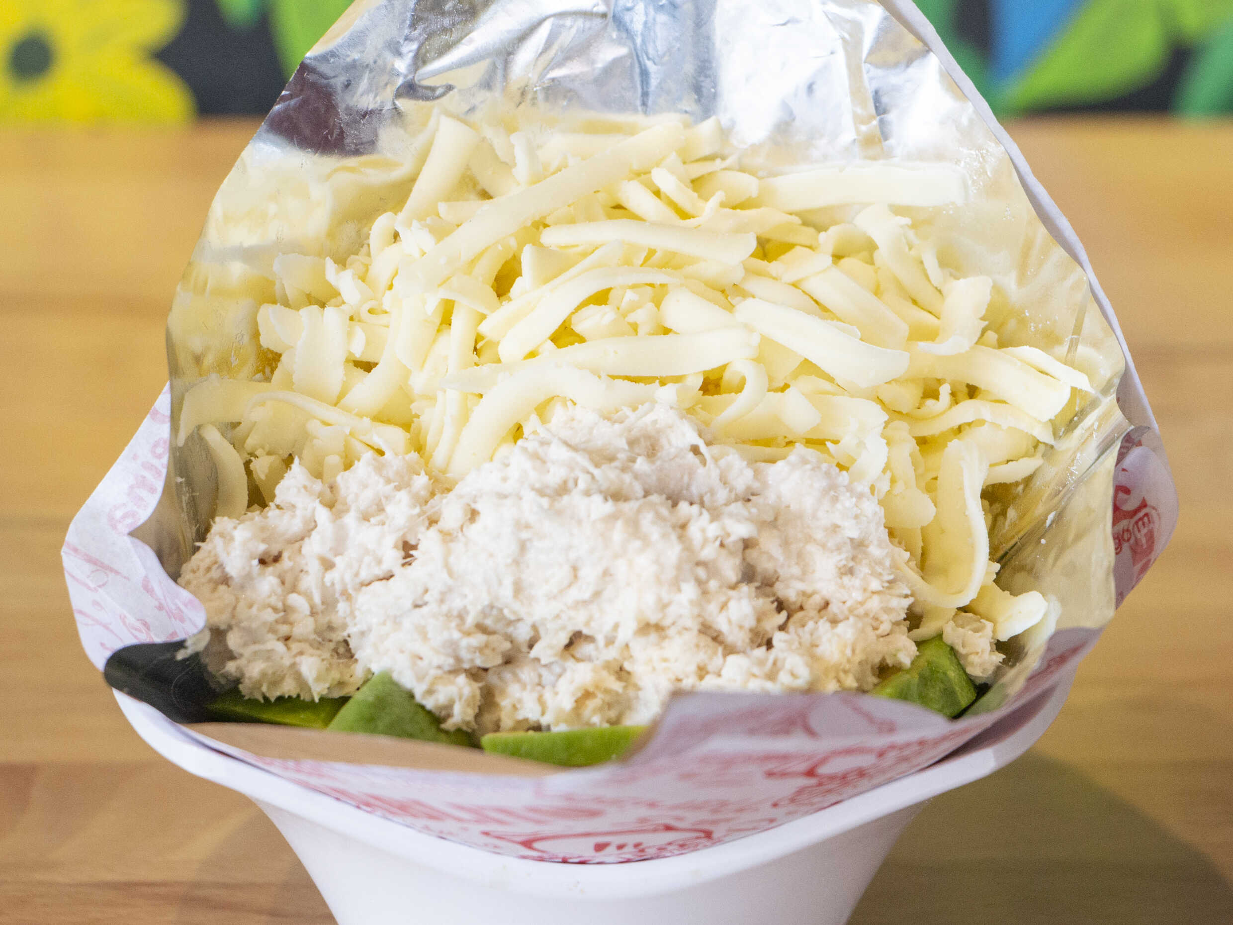 Reina pepiada con queso amarillo.