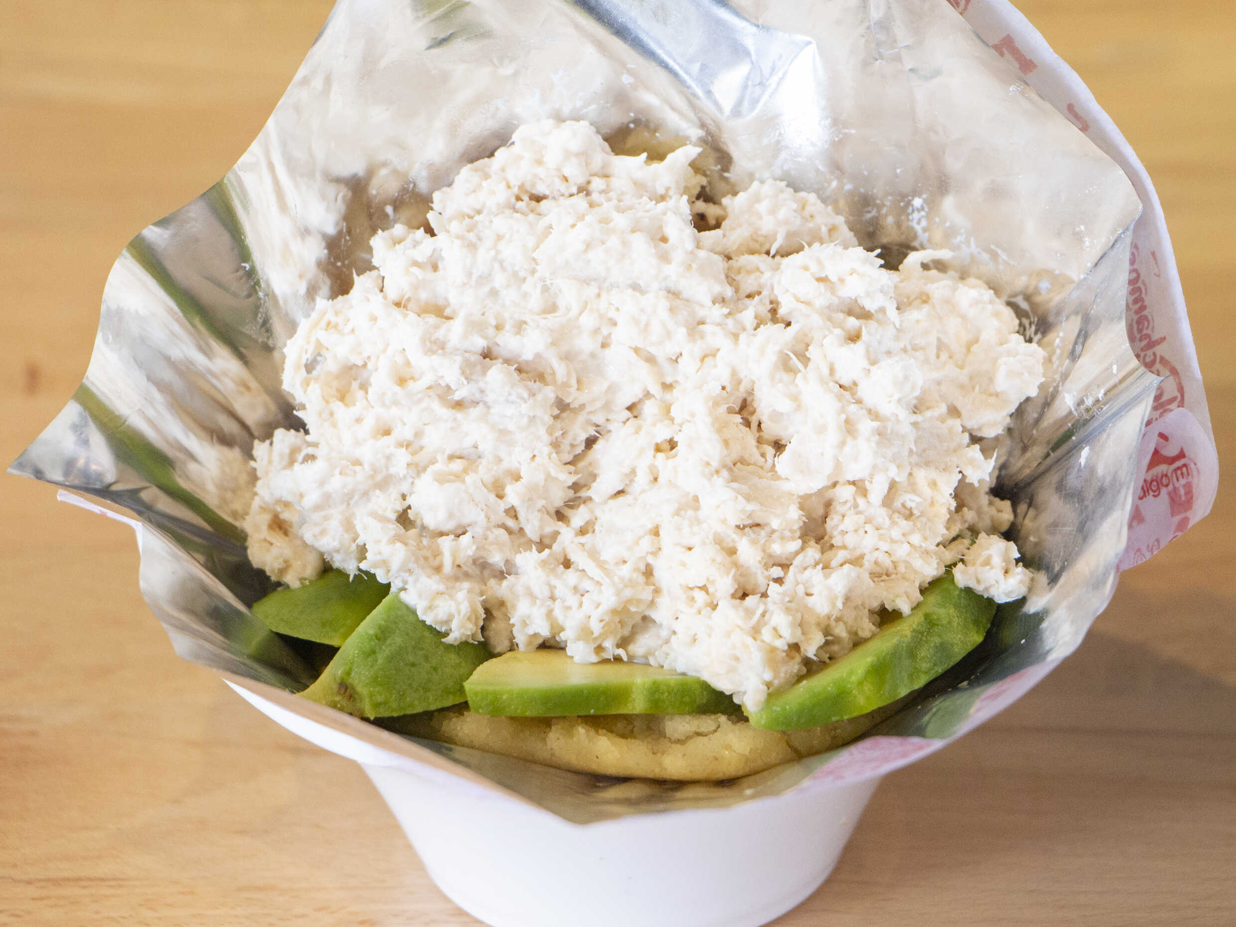 Arepa con crema de pechuga de pollo y aguacate.
