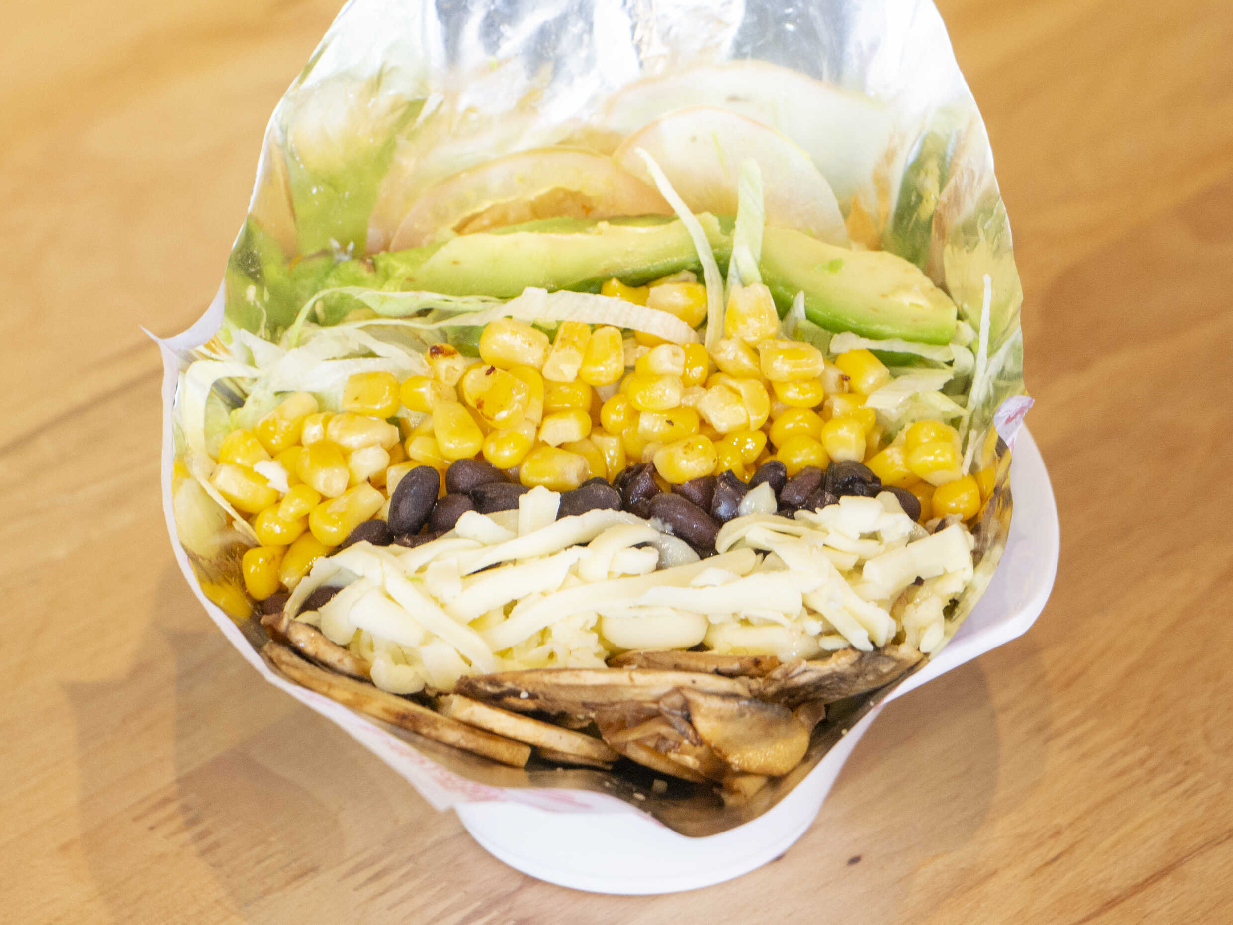 Arepa con Champiñón, maíz, caraota (Frijoles negros), aguacate, tomate, lechuga y queso blanco.