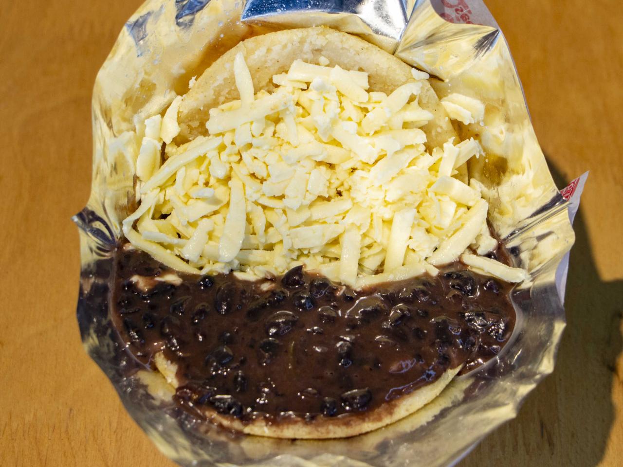 Arepa con caraotas (Fríjoles negros ) con queso blanco.