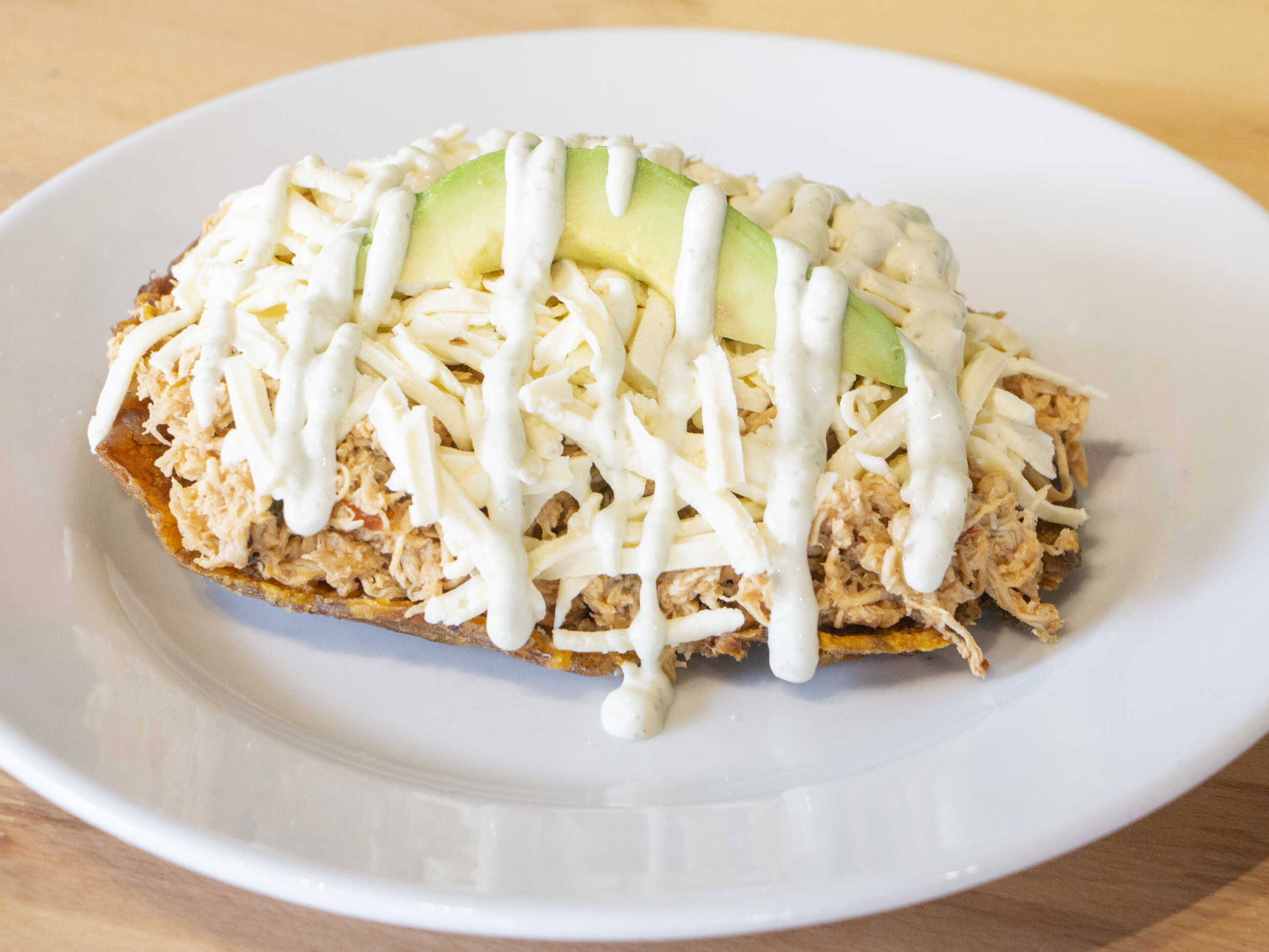 Plátano maduro, queso, aguacate, proteína a elección y salsa de la casa.