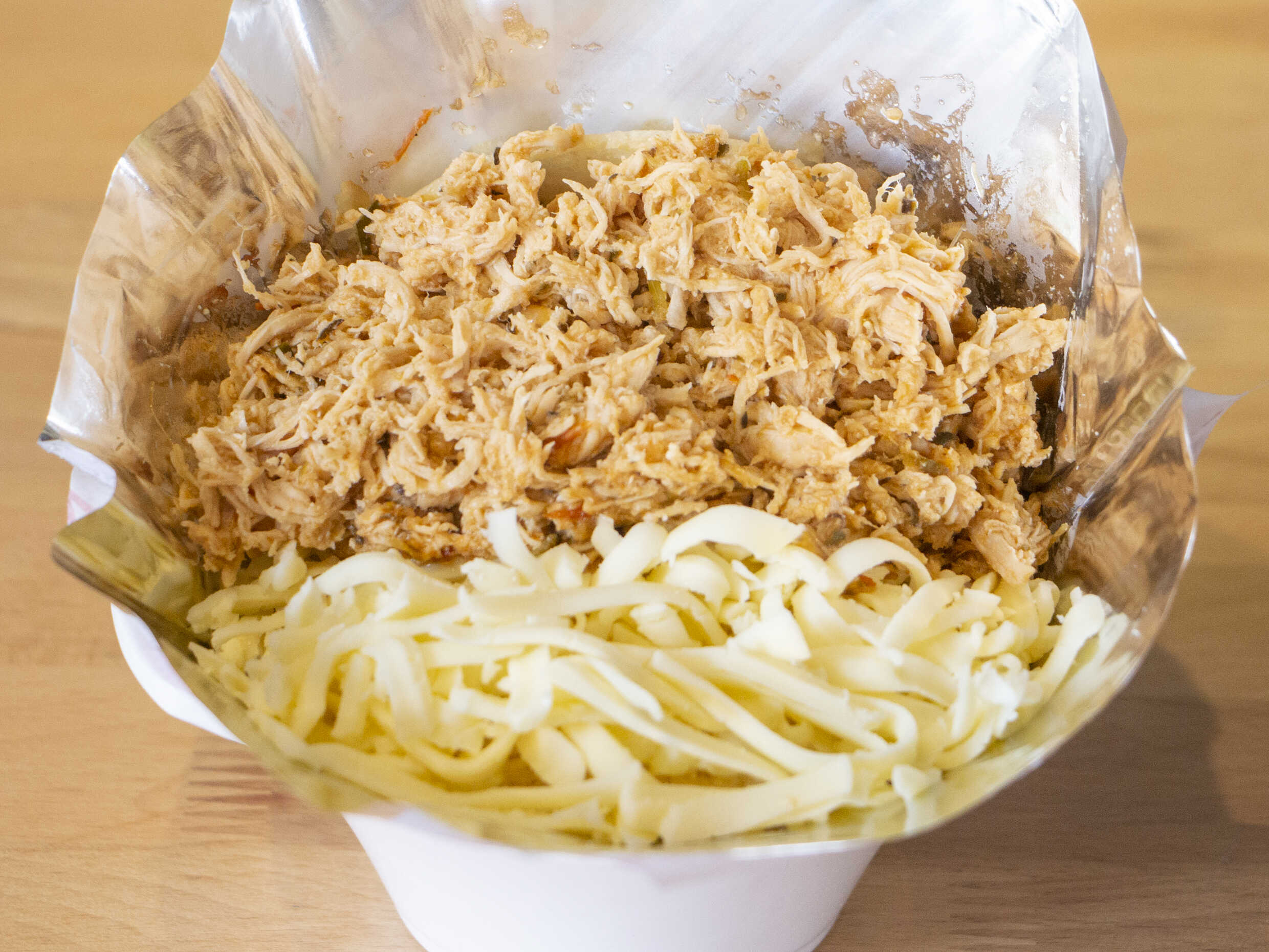 Tortilla de harina de maiz tierno con pollo y queso de mano