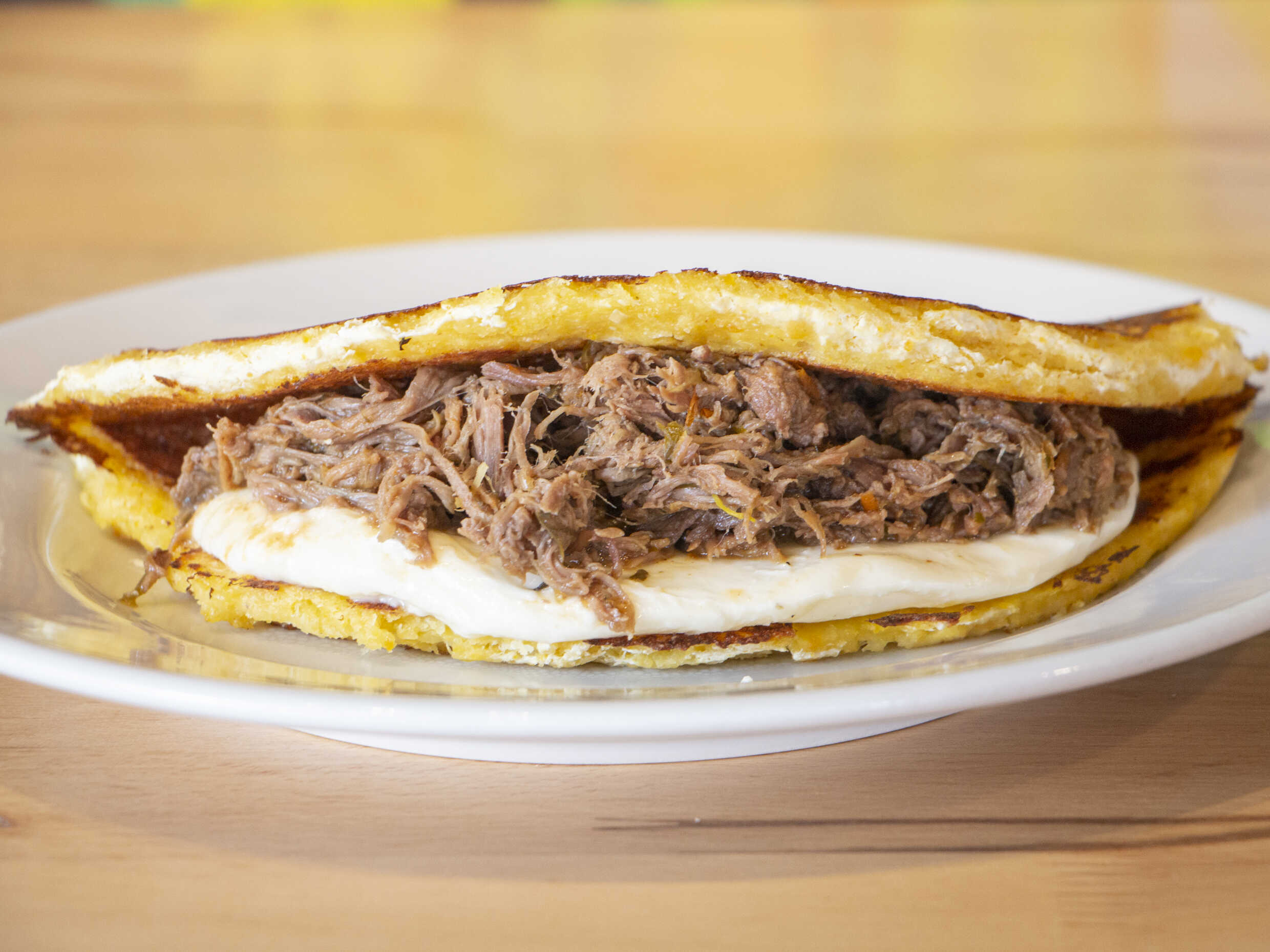 Arepa con carne desmechada y queso amarillo.