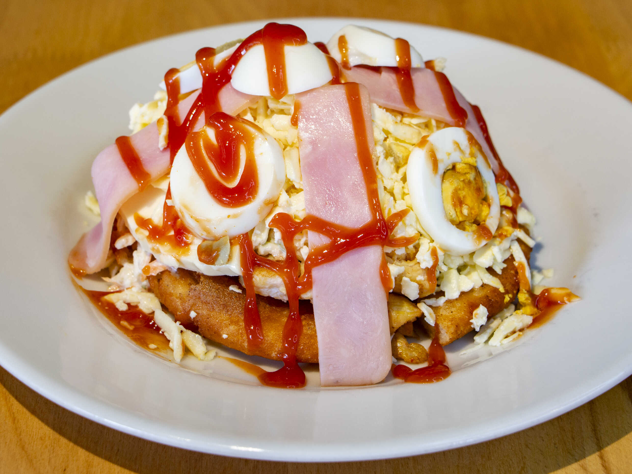Pan tradicional, queso cheddar, tocineta, tomate, ripio de papas, huevo frito, ketchup, Chuleta Ahumada y salsa de la casa.