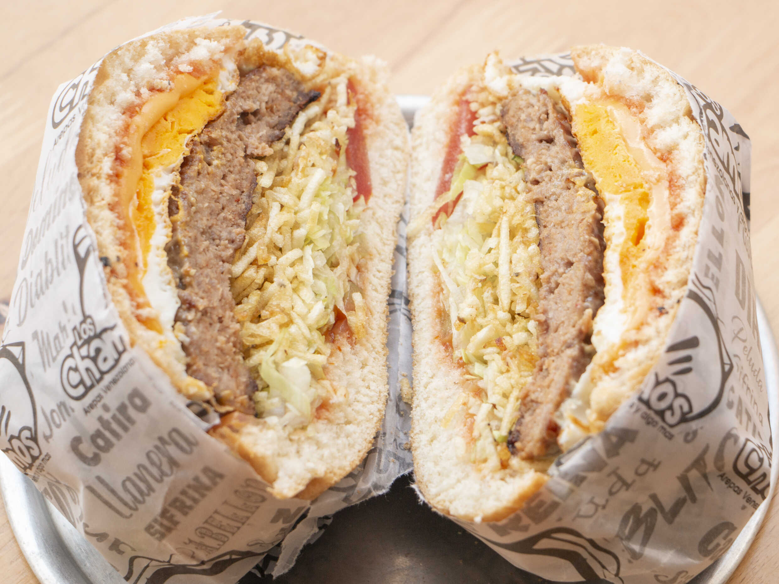 Pan tradicional, queso cheddar, tocineta, tomate, ripio de papas, huevo frito, ketchup, proteína a elección y salsa de la casa.