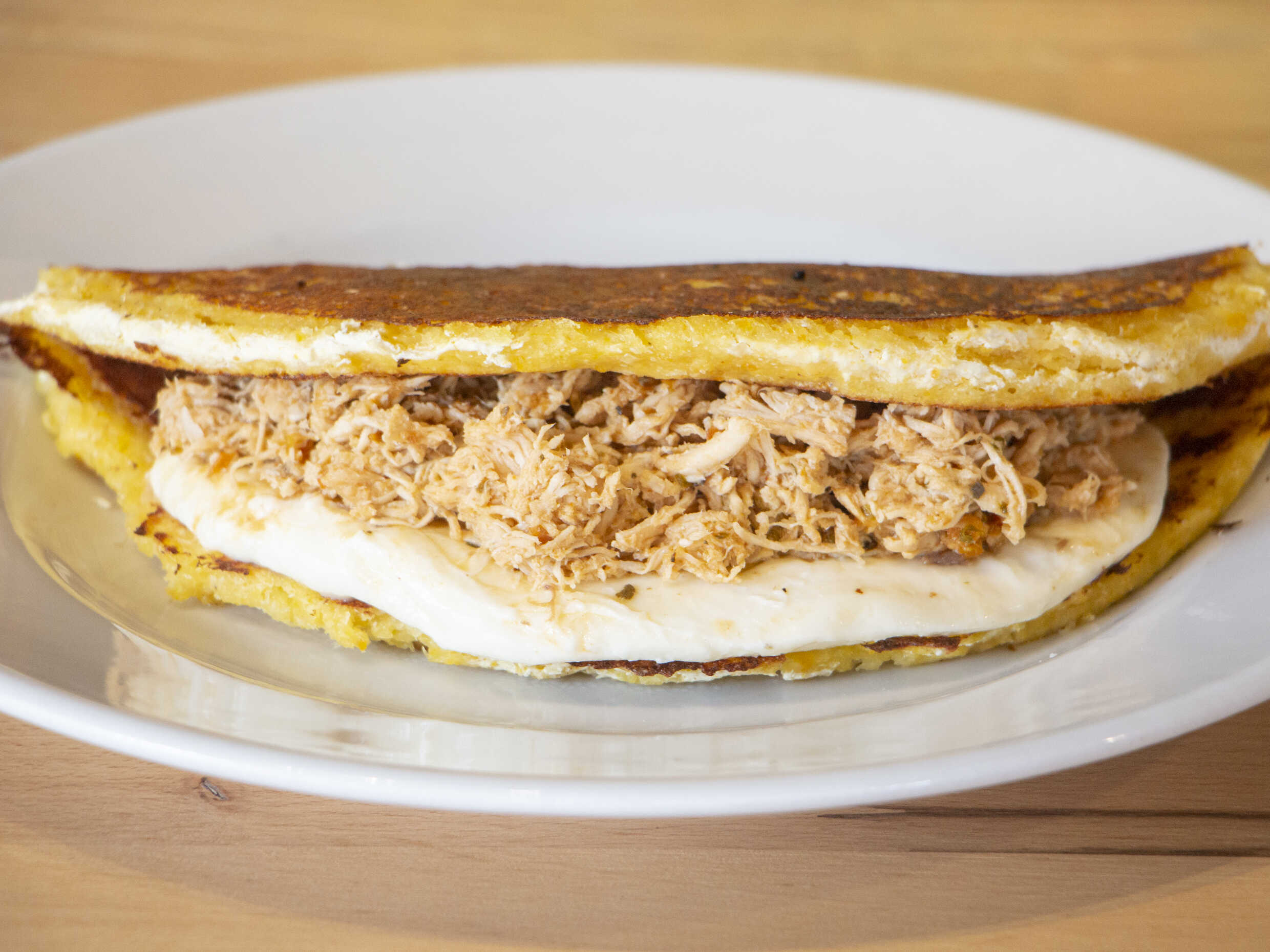 Arepa con Pollo me-c:hado con queso blanco