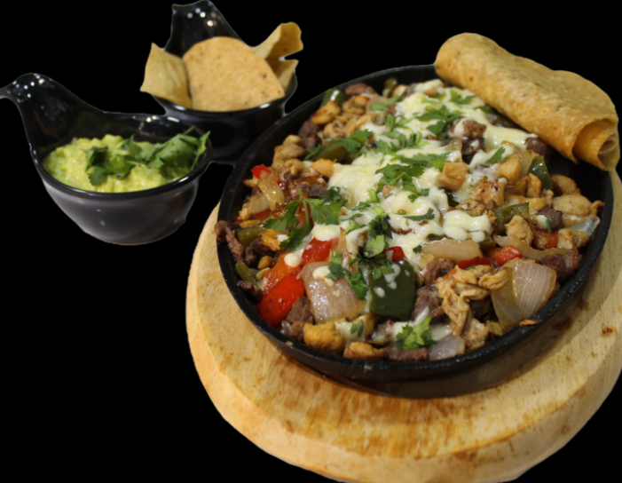 Platillo típico con carne, pimientos, cebolla, queso fundido y tortillas para acompañar.