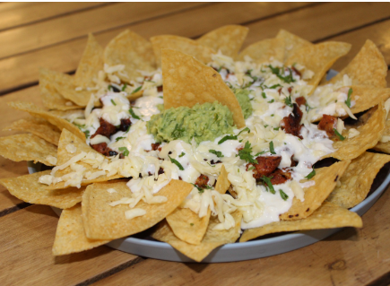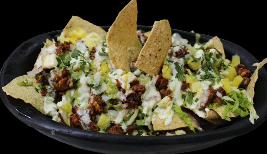 Nachos con carne al pastor, queso fundido y pico de gallo.