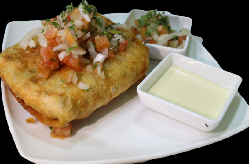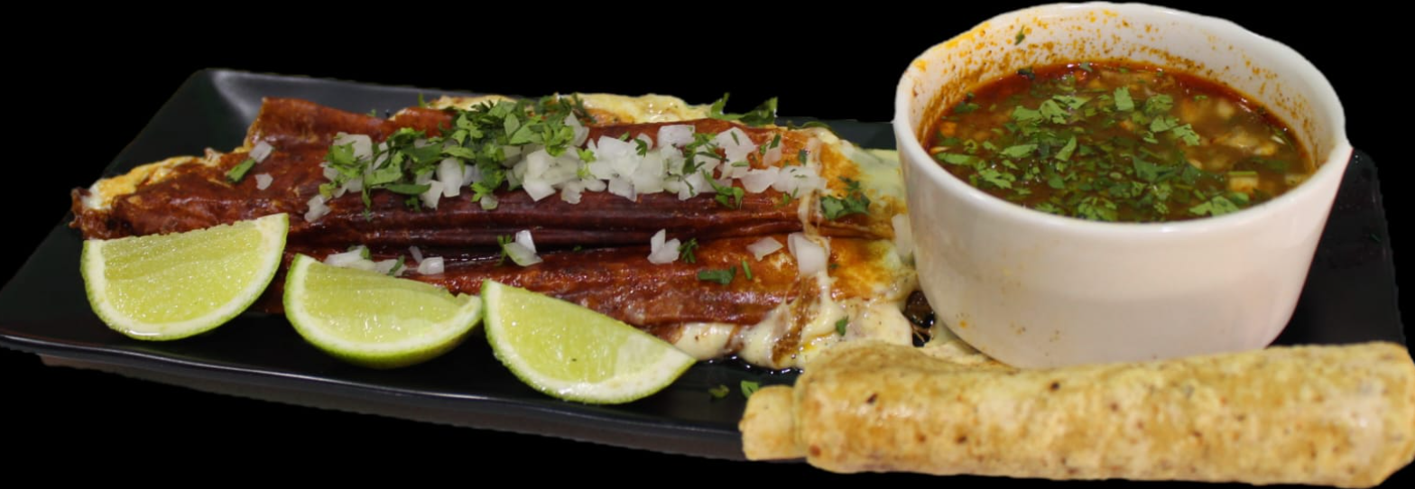 Burrito relleno de birria jugosa, arroz, frijoles y queso fundido, acompañado de consomé.