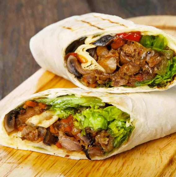 Burrito con carne asada jugosa, arroz, frijoles y queso, envuelto en tortilla de harina.