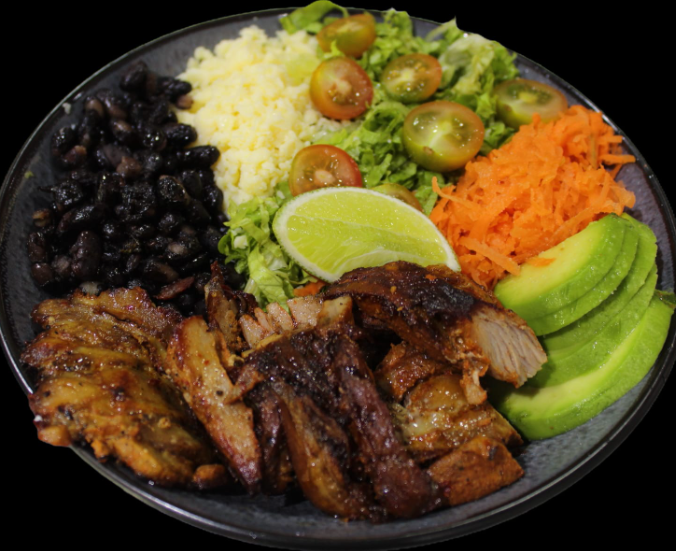 Burrito al pastor con piña, arroz, frijoles y queso derretido.