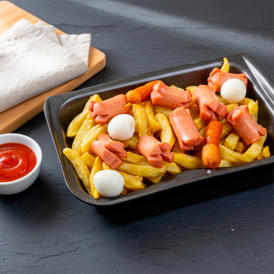 Papas fritas, choricitos, salchicha y huevito de codorniz
