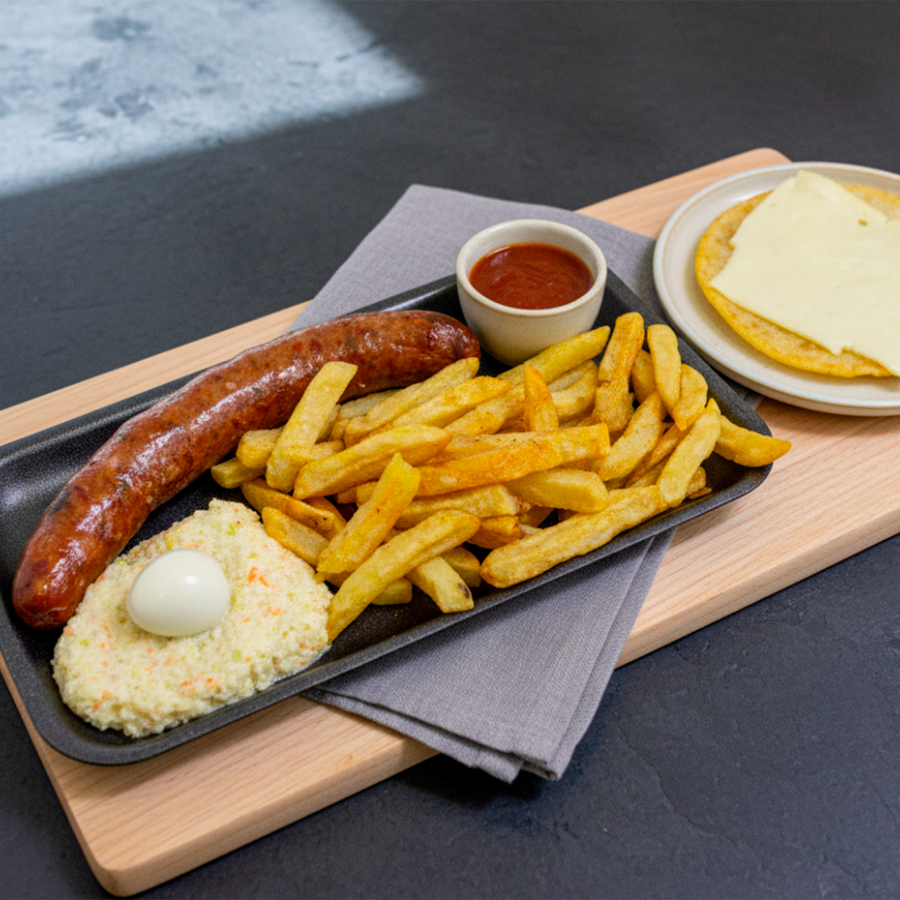 chorizo, con papitas fritas, ensalada de repollo, arepa con queso