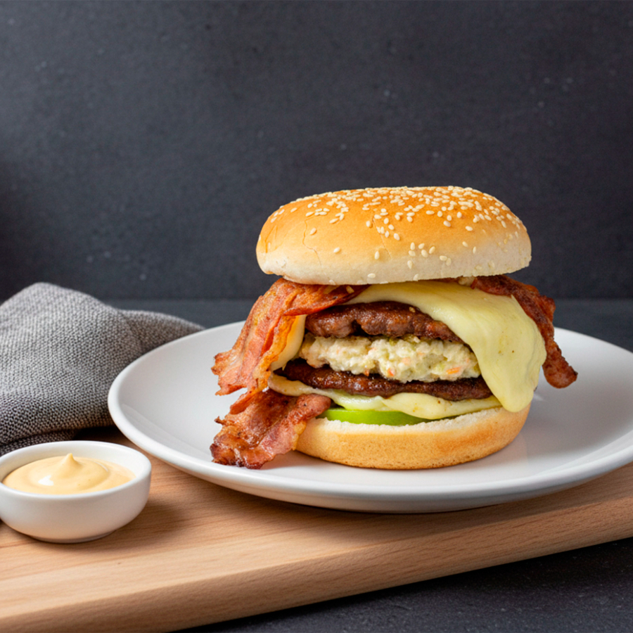 Pan, tomate verde, ensalada de repollo y mayonesa, ripio de papa , doble filete de pechuga, doble tocineta, queso mozzarella, salsas y cebolla a elección.