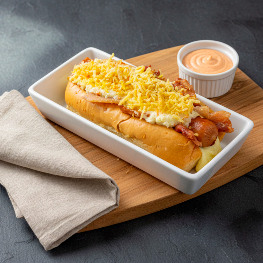 Pan, tocineta ahumada, queso mozzarella derretido, ensalada de repollo y mayonesa, ripio de papa, salsas y cebolla a elección.