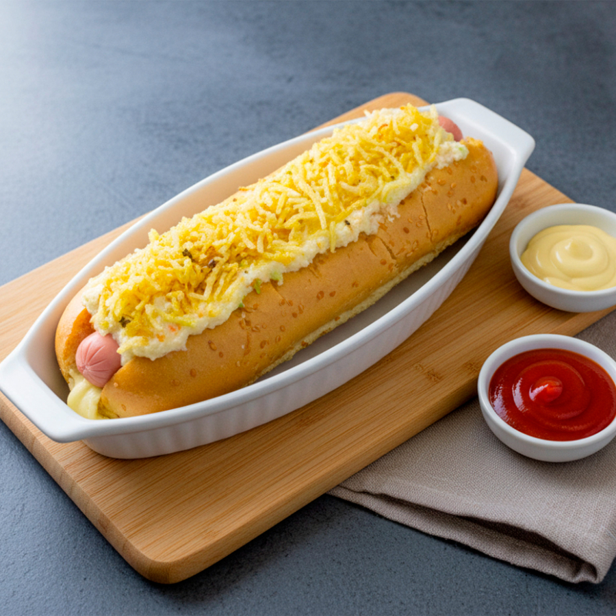 Pan, salchicha Zenú, queso mozzarella derretido, ensalada de repollo y mayonesa, ripio de papa, salsas y cebolla a elección.