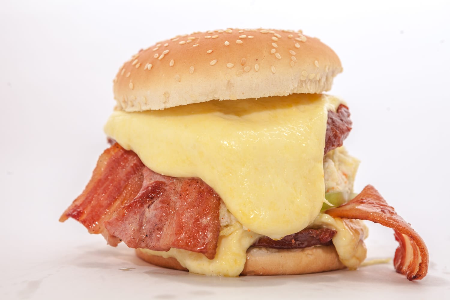 Pan, tomate verde, ensalada de repollo y mayonesa, ripio de papa, doble carne de res, doble tocineta, doble queso mozzarella, salsas y cebolla a elección.