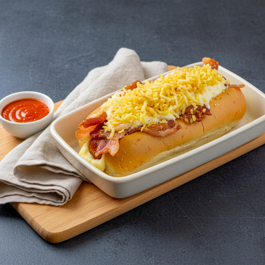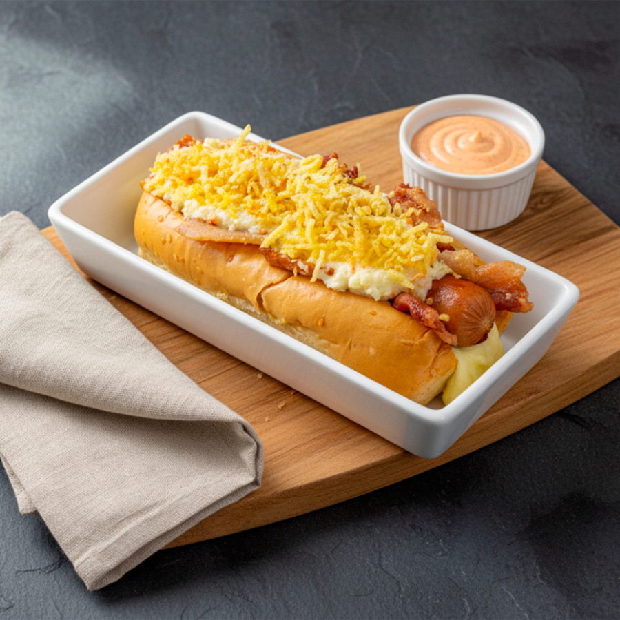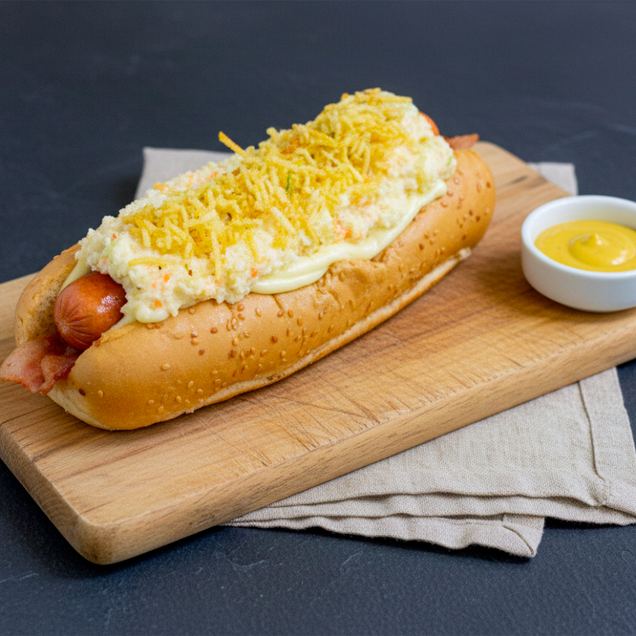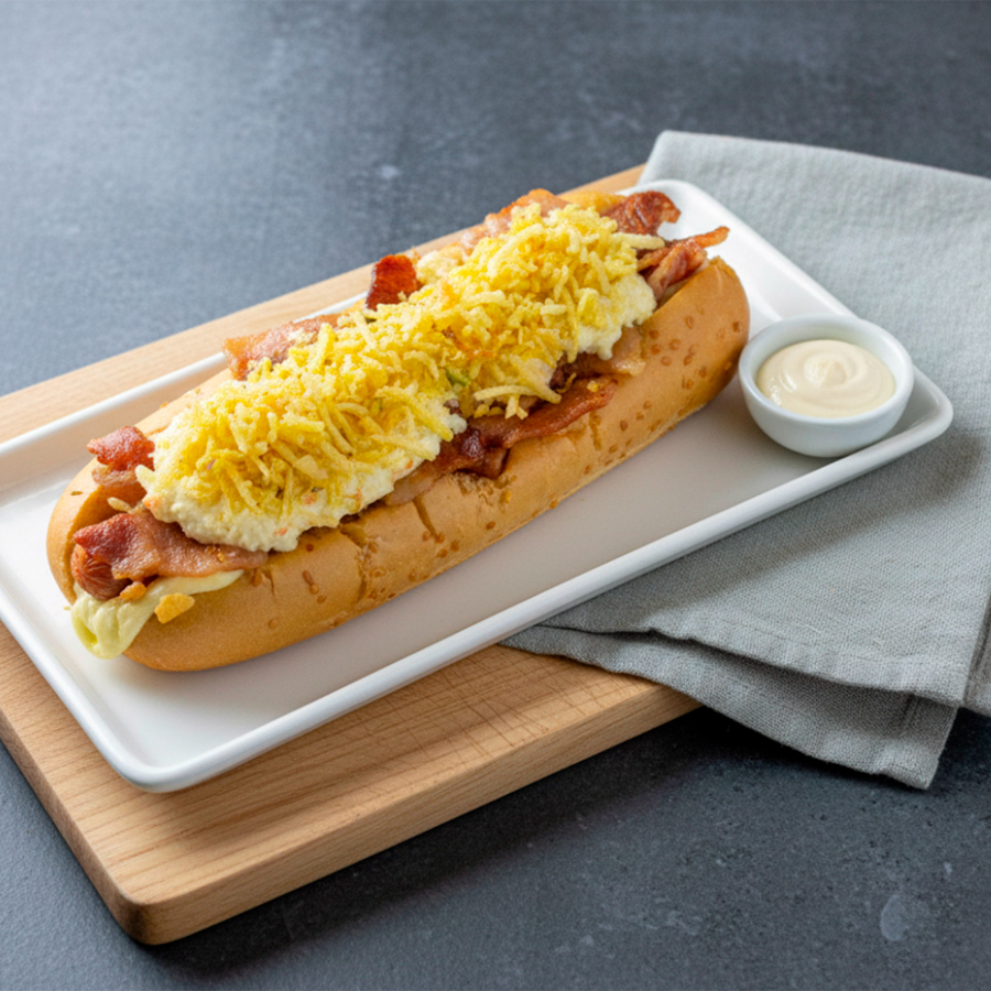 Pan, tocineta ahumada, queso mozzarella derretido, ensalada de repollo y mayonesa, ripio de papa, salsas y cebolla a elección.