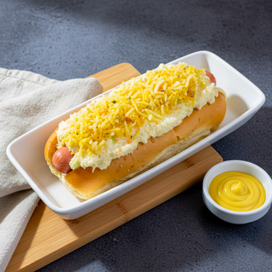 Pan, salchicha Zenú, queso mozzarella derretido, ensalada de repollo y mayonesa, ripio de papa, salsas y cebolla a elección.