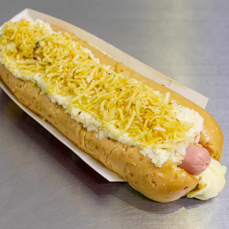 Pan fresco, rico chorizo, queso mozzarella derretido, ensalada de repollo y mayonesa, ripio de papa, cebolla caramelizada o cruda, salsas al gusto