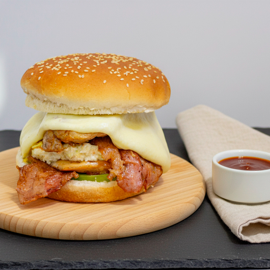 Pan, tomate verde, ensalada de repollo y mayonesa, ripio de papa , doble filete de pechuga, doble tocineta, queso mozzarella, salsas y cebolla a elección.