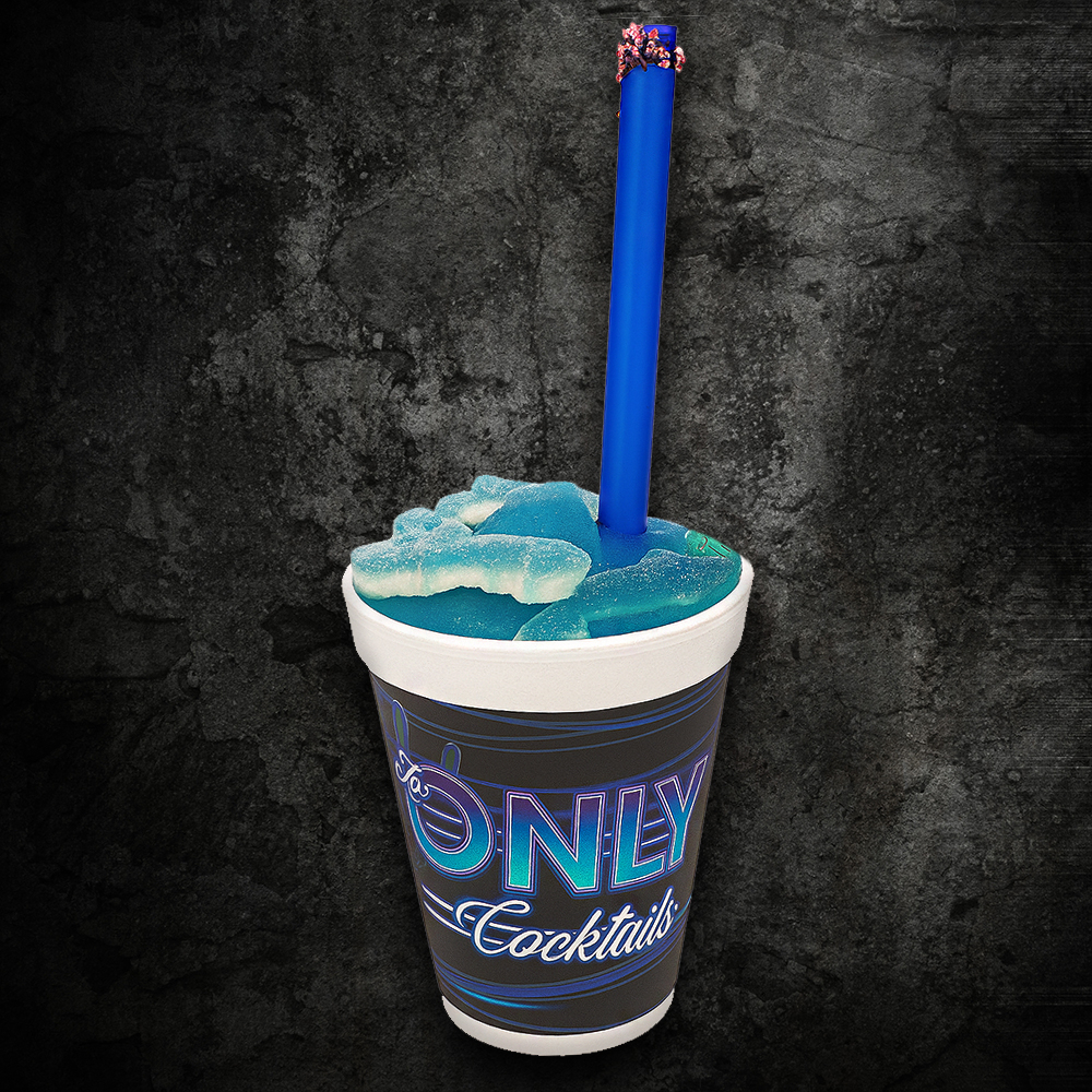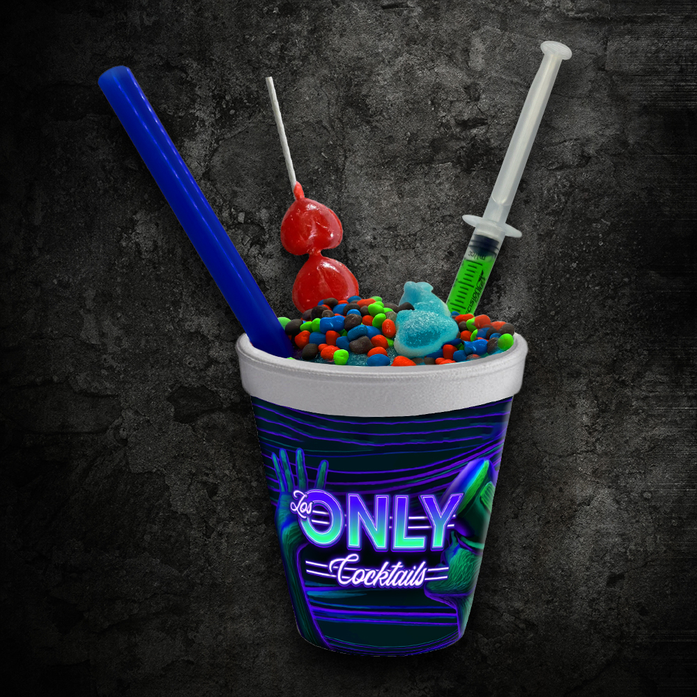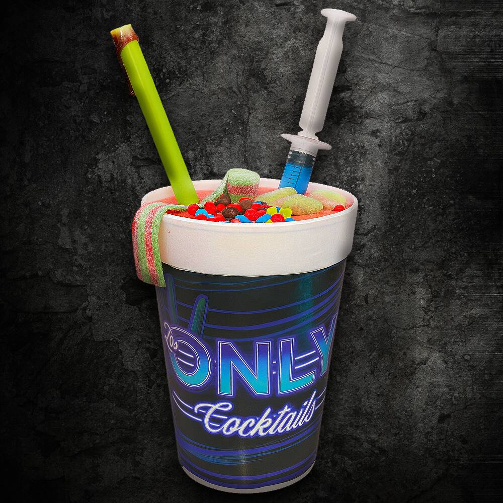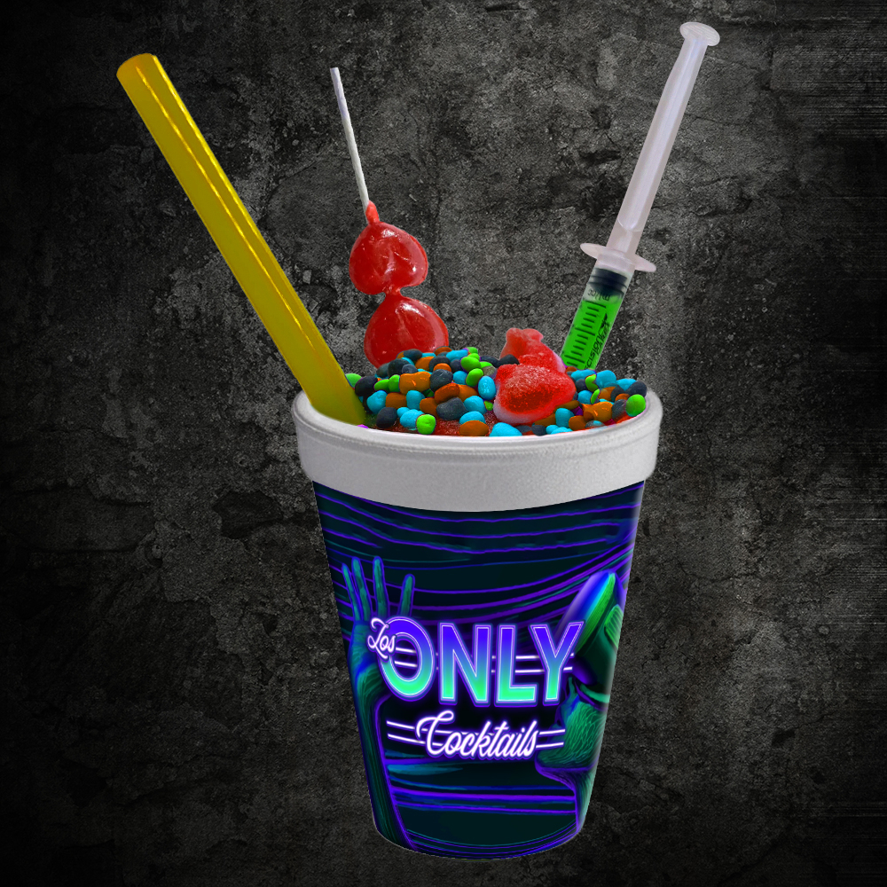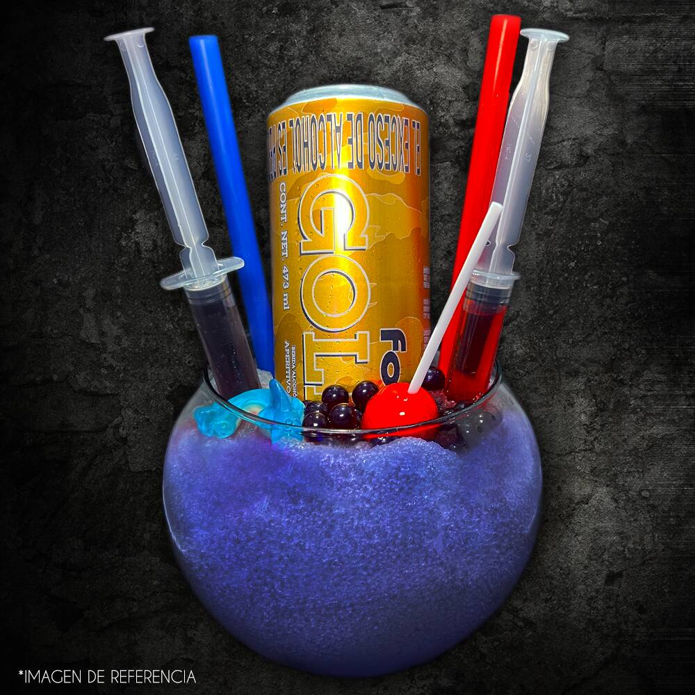 Granizado exótico de tu elección, four loko de tu elección, 4 toppings, 2 jeringas de 10ml, perlas explosivas.