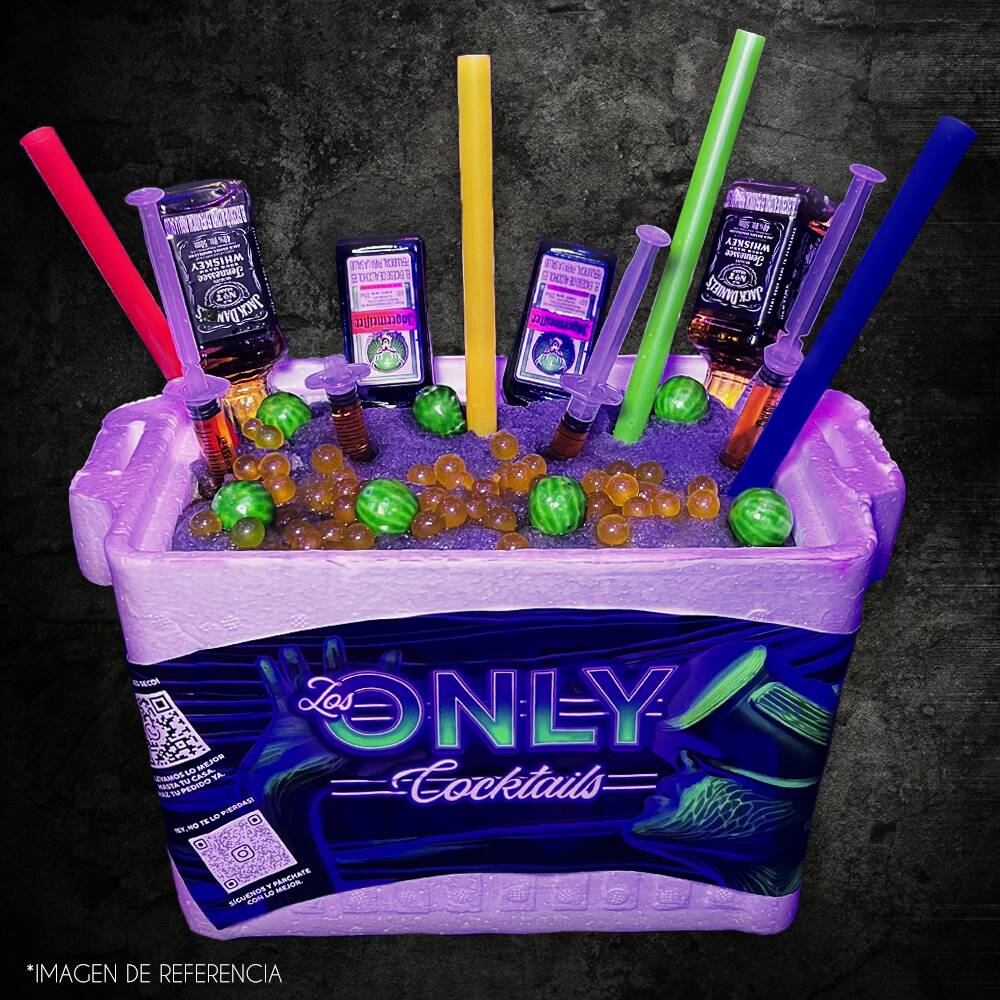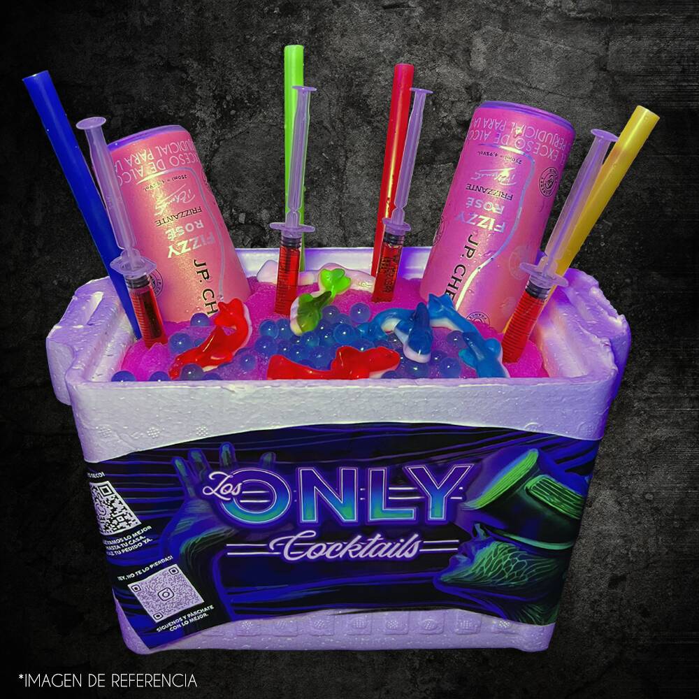 Nevera 3lt + 2 Jp Chenet en lata + 15 toppings + perlas explosivas.