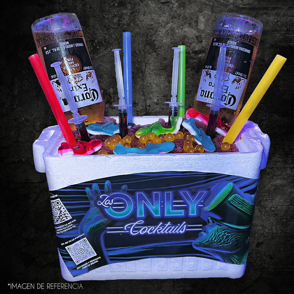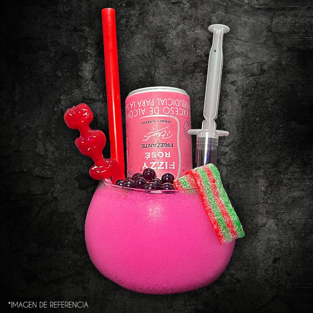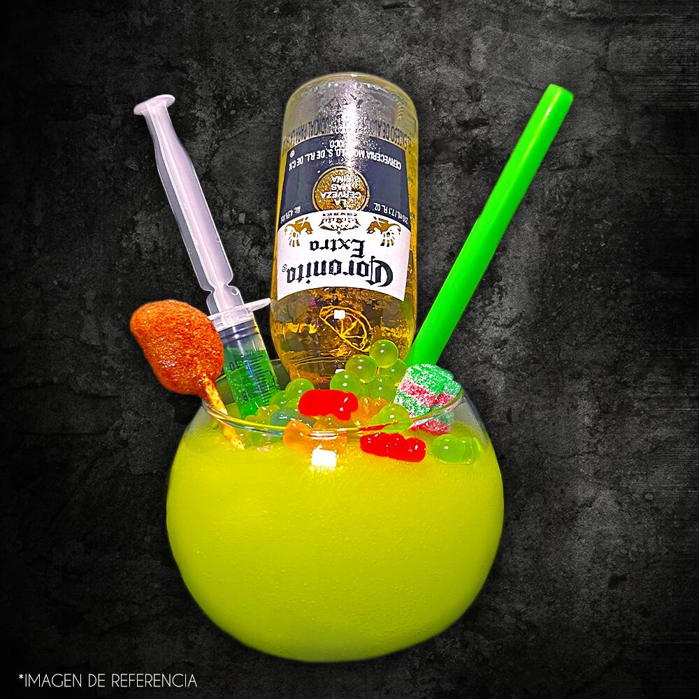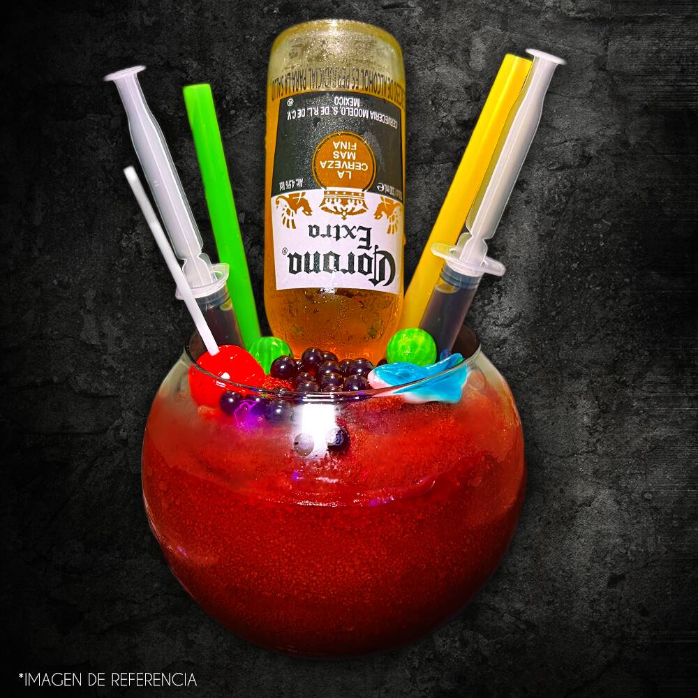 Granizado exótico de tu elección, cerveza corona de 330ml, 4 toppings, 2 jeringas de 10ml, perlas explosivas