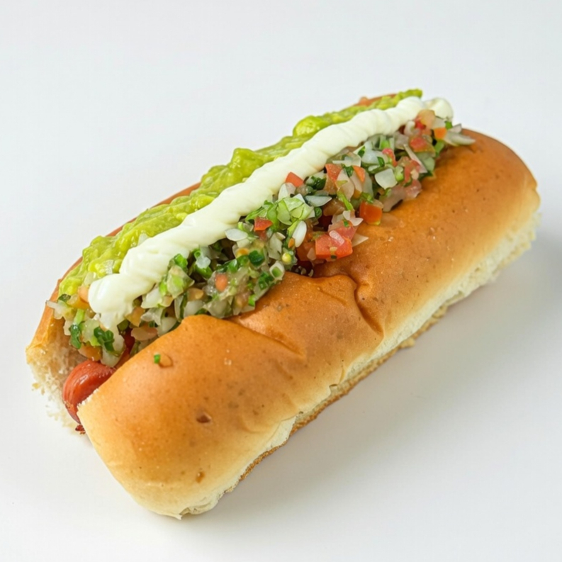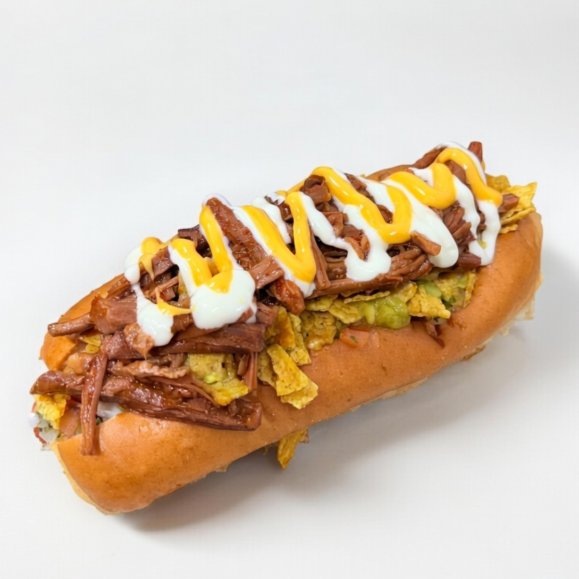 El más tradicional y delicioso, salchicha asada, guacamole, pico de gallo, sour cream y nachos troceados.