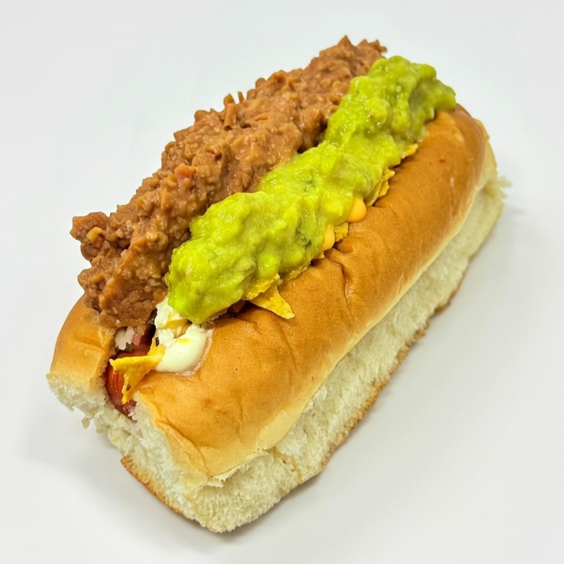 Delicioso chili con carne sobre salchicha asada, con guacamole, pico de gallo, sour cream y nachos troceados.