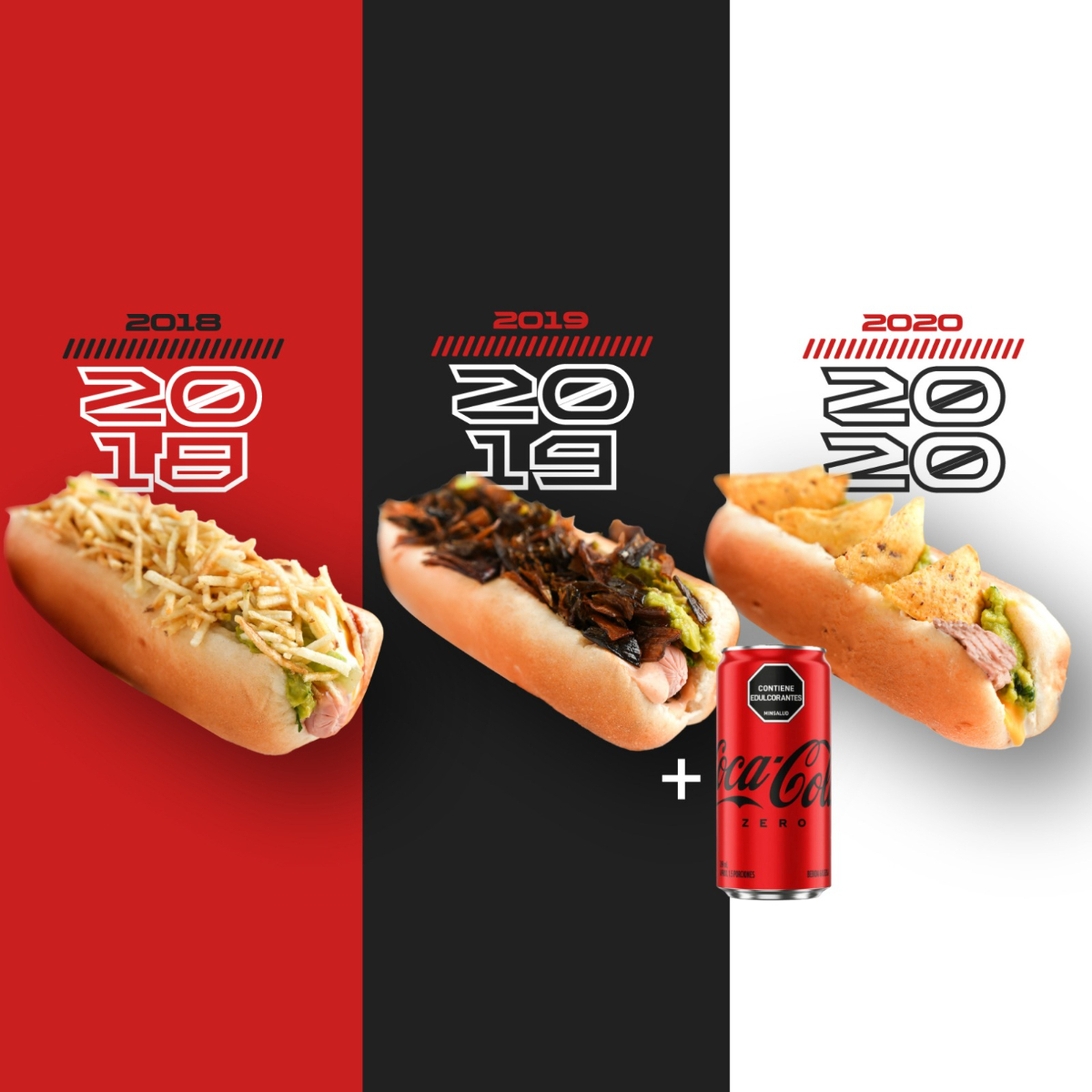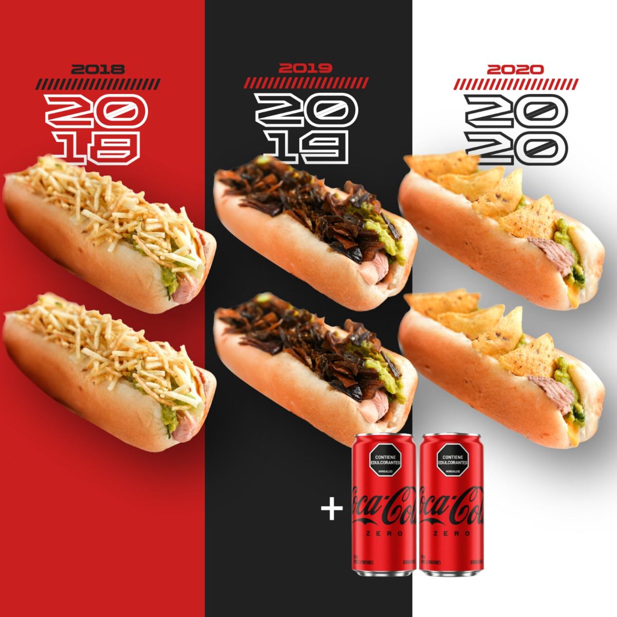 2 perritos 2018, 2 perritos 2019 y 2 perritos 2020 acompañado de 2 Coca Cola a elección
