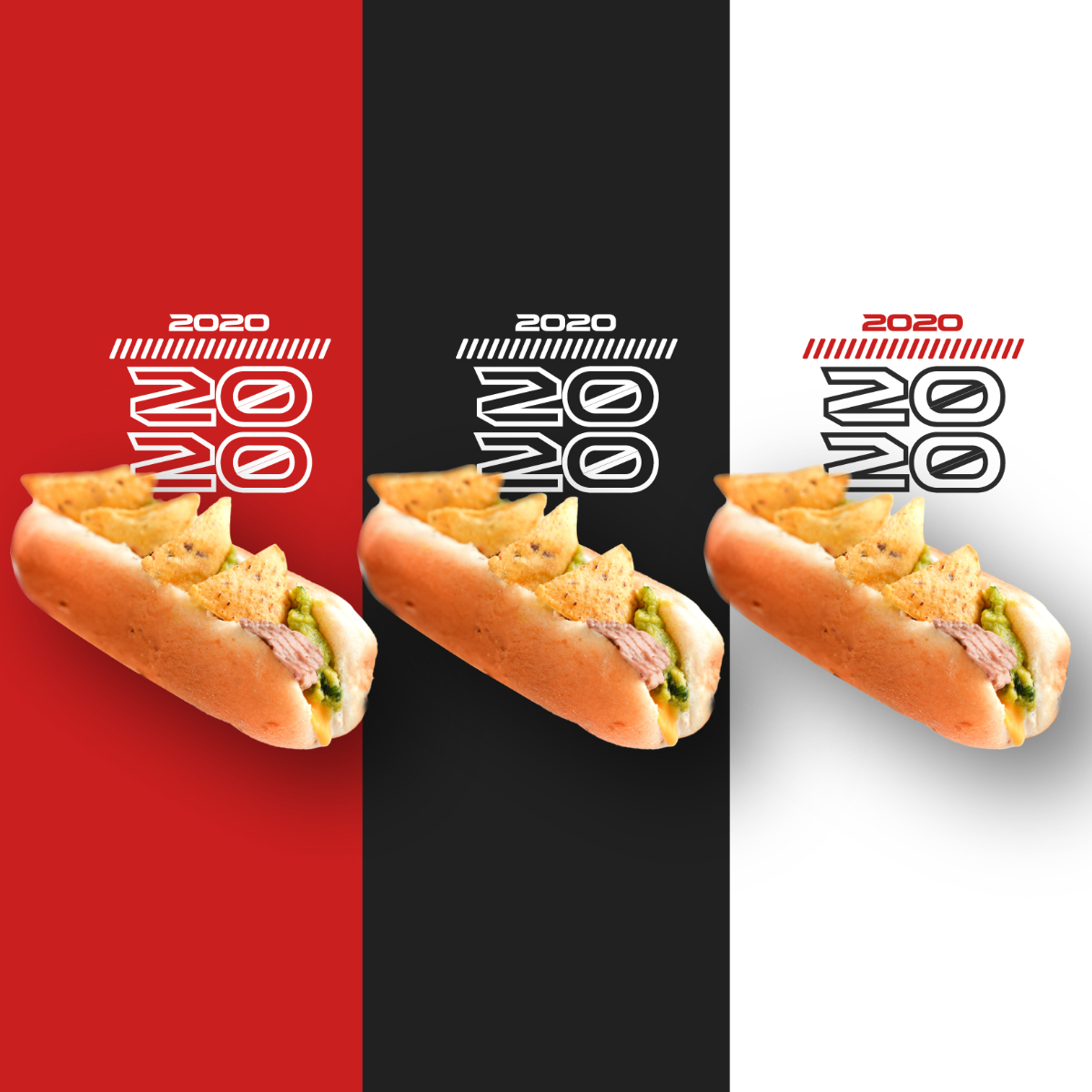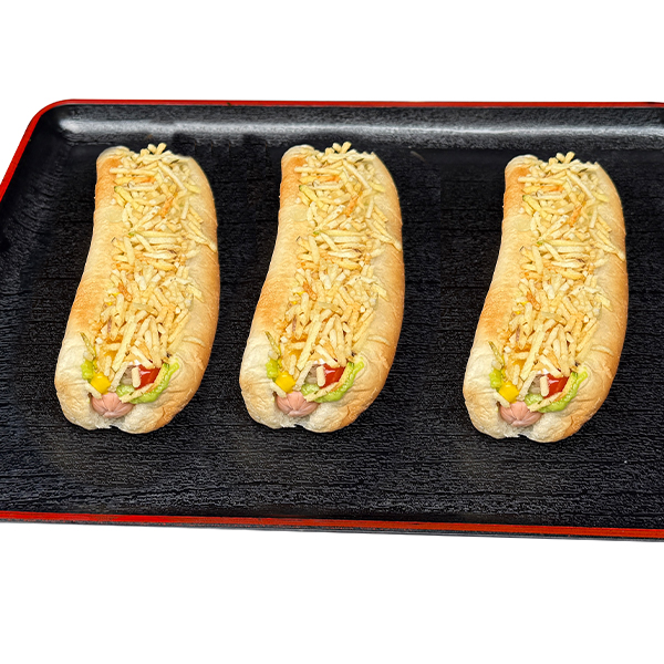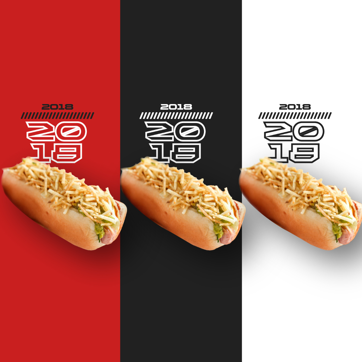 3 Perritos 2018 hechos con pan, salchicha, aguacate, picadillo de tomate, cebolla, salsa de tomate, mostaza, mayonesa, piña y ripio de papa.