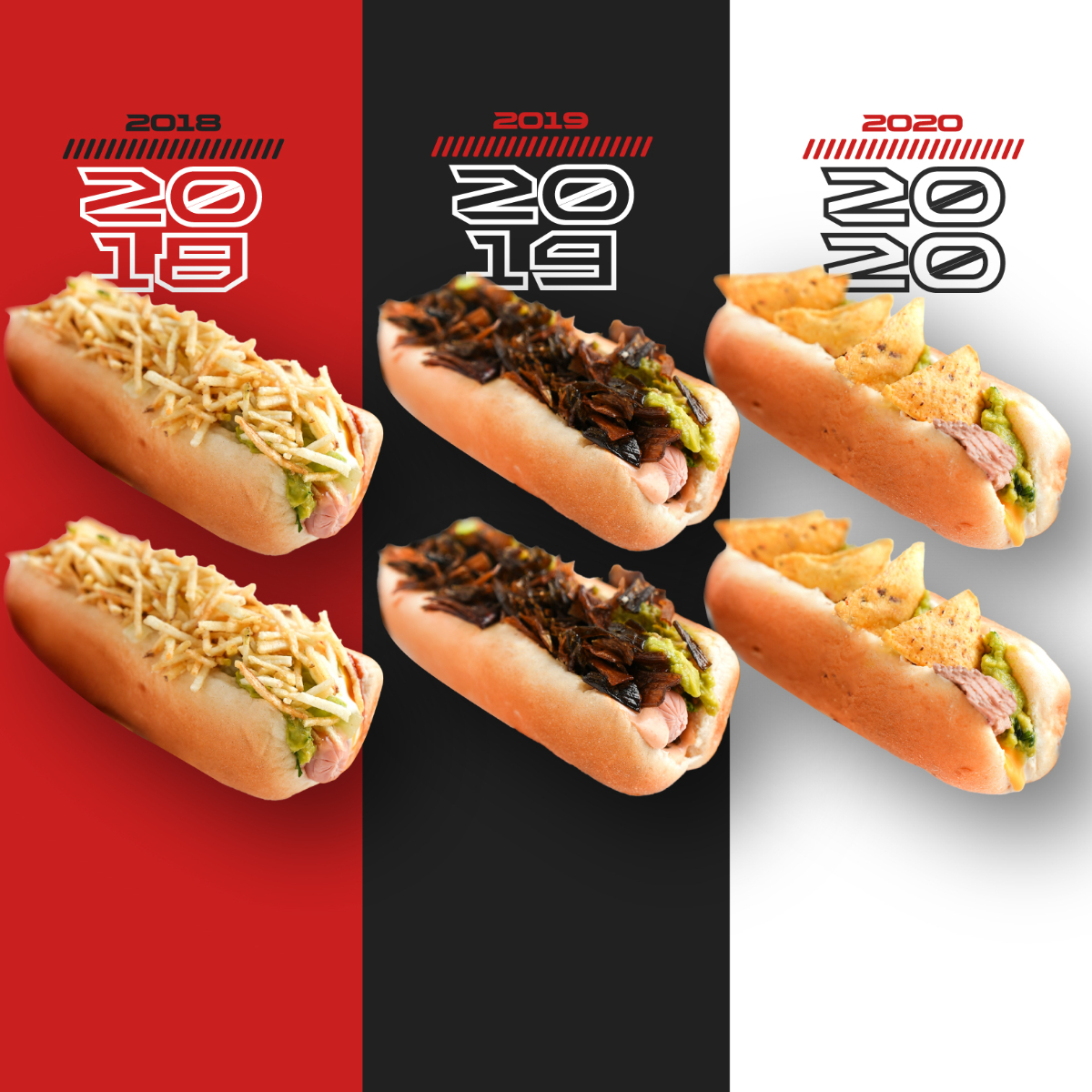 6 Perritos 2019 hechos con salchicha, pan, puerro caramelizada, chipotle, aguacate.