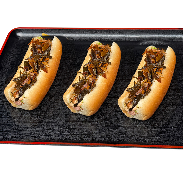 3 Perritos 2019 hechos con pan, salchicha, aguacate, chipotle y puerro caramelizado.
