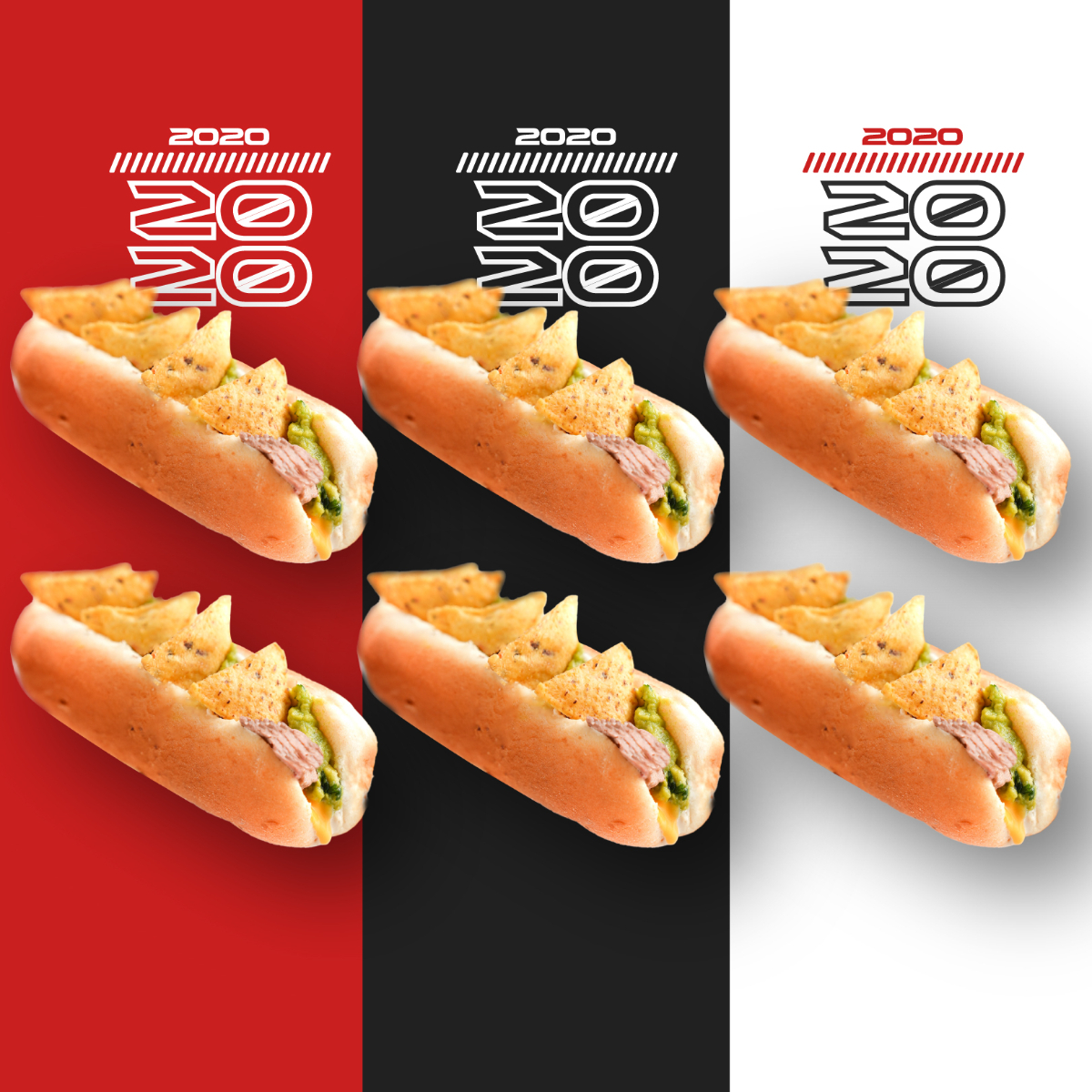 6 Perritos 2020 hechos con pan, aguacate, salsa del mono, punta de anca, salsa de queso cheddar y tostacos.