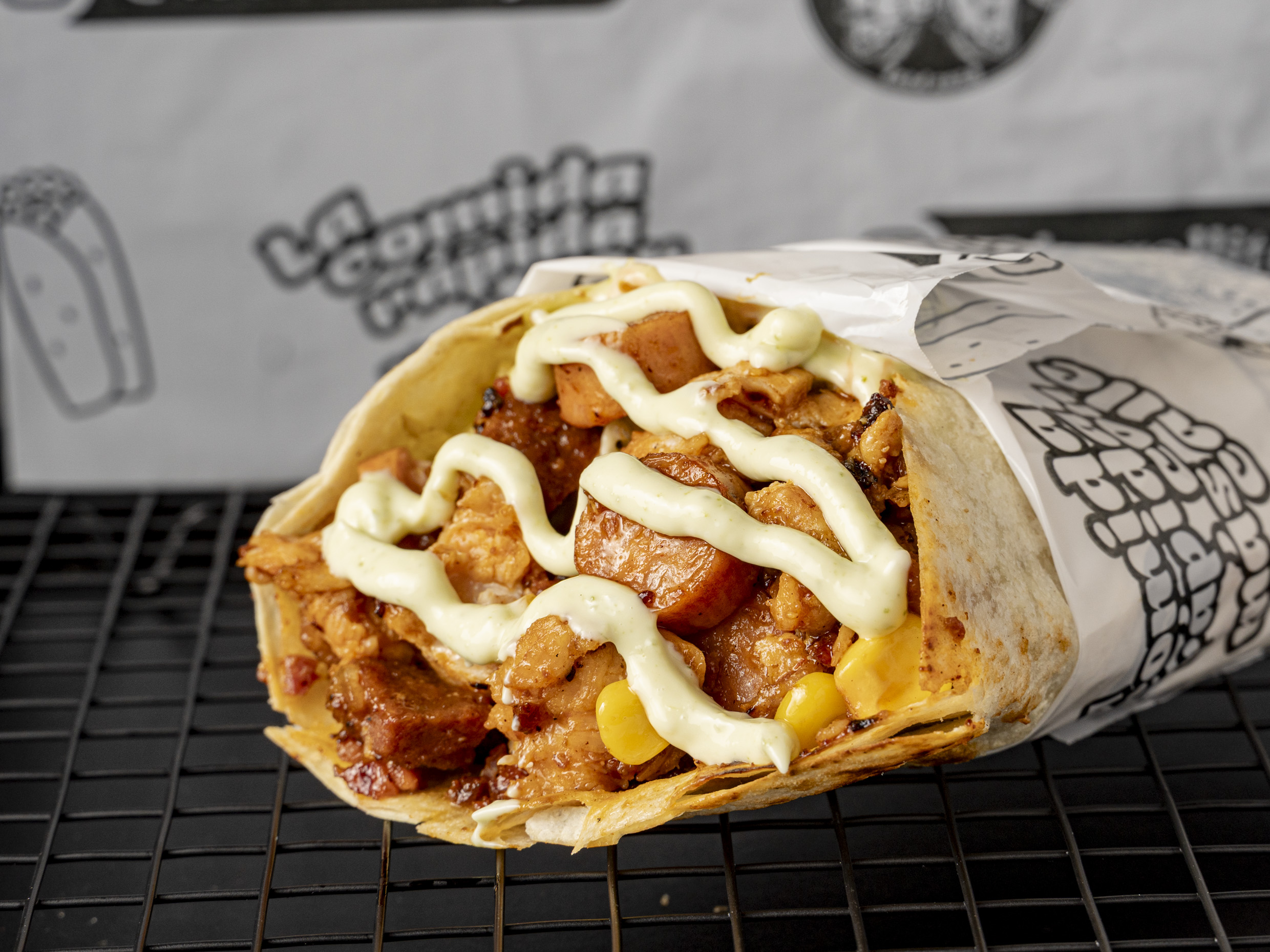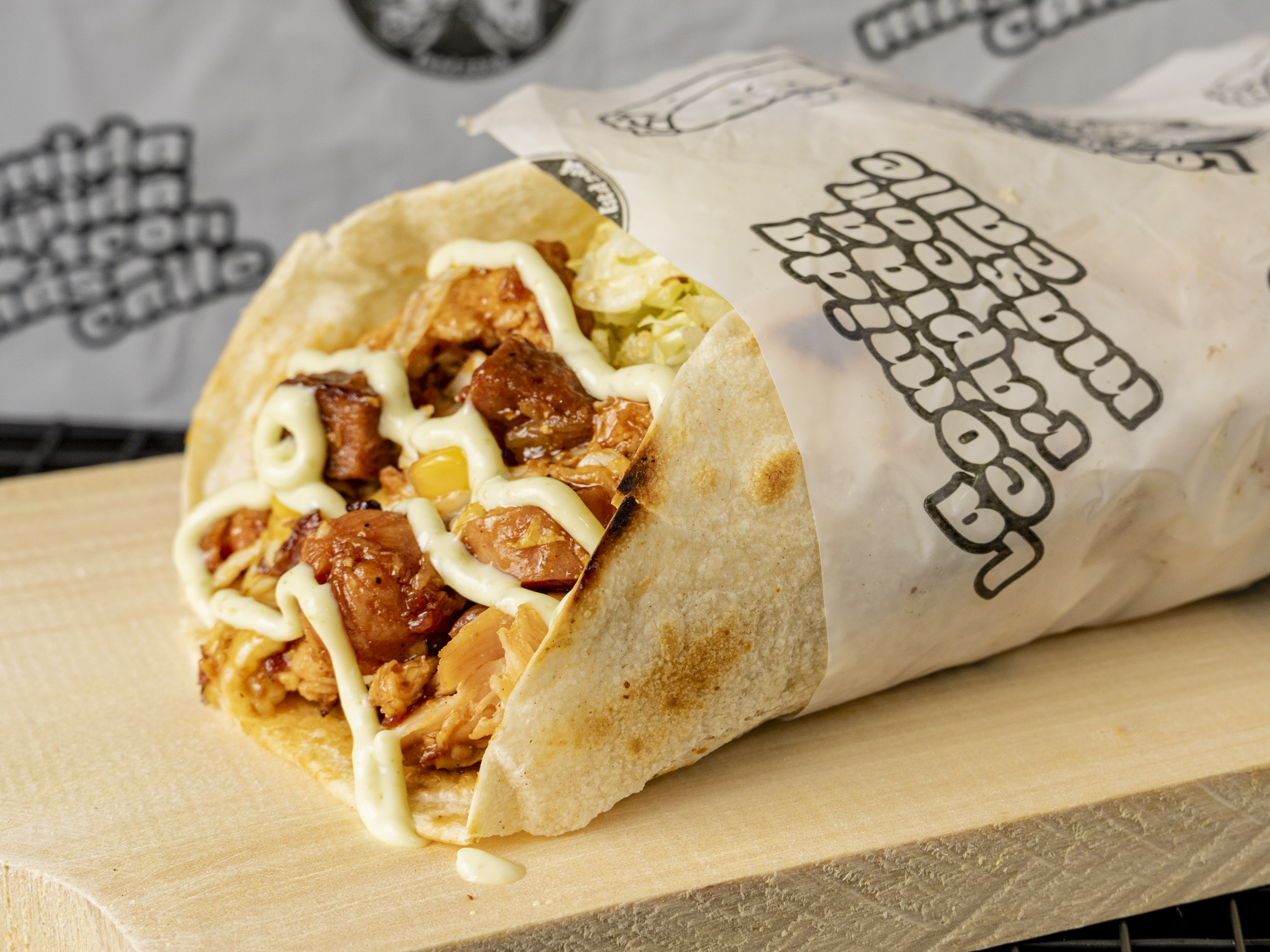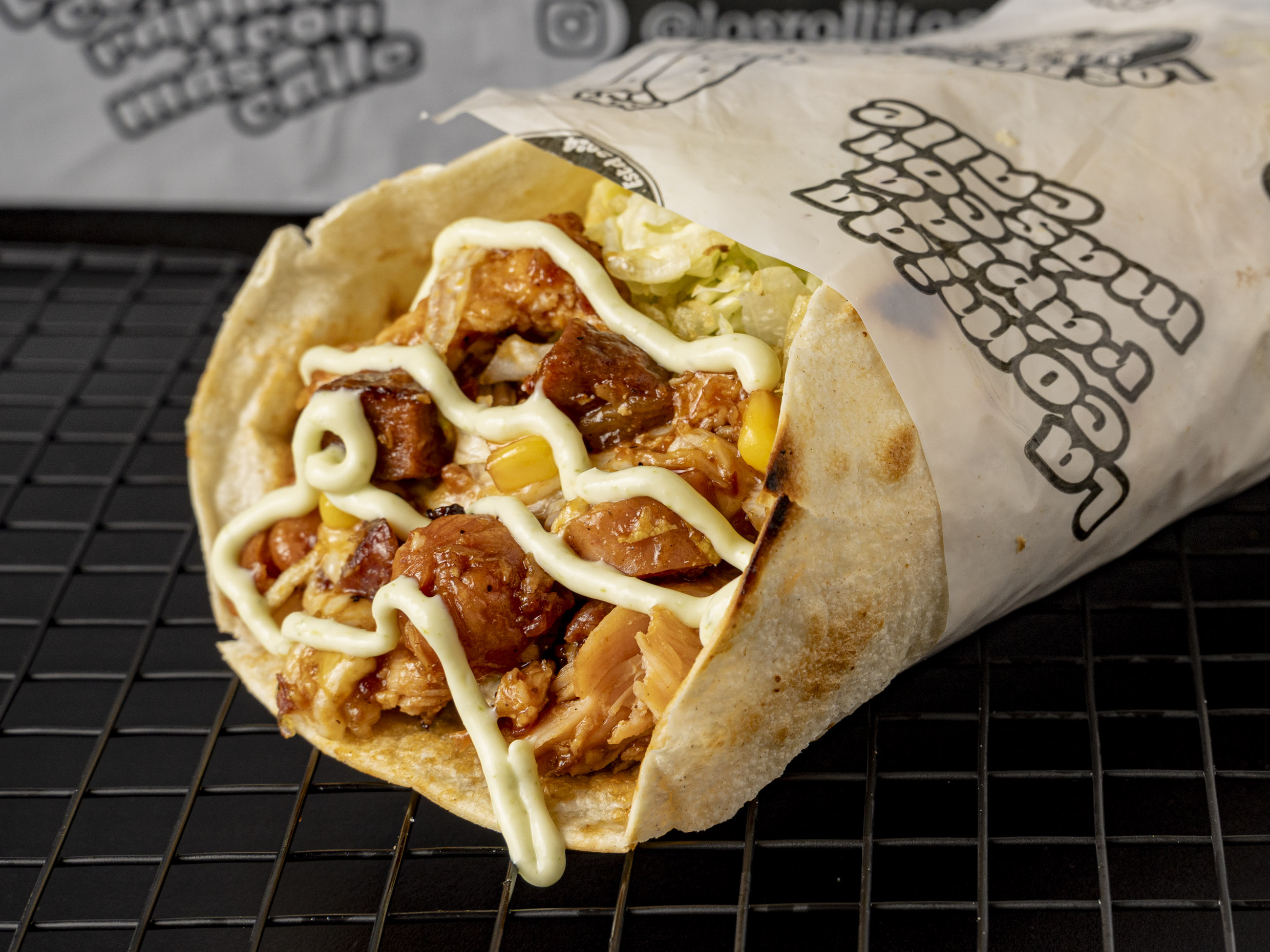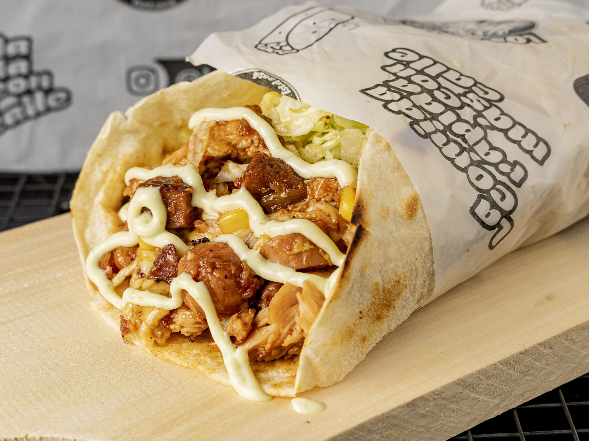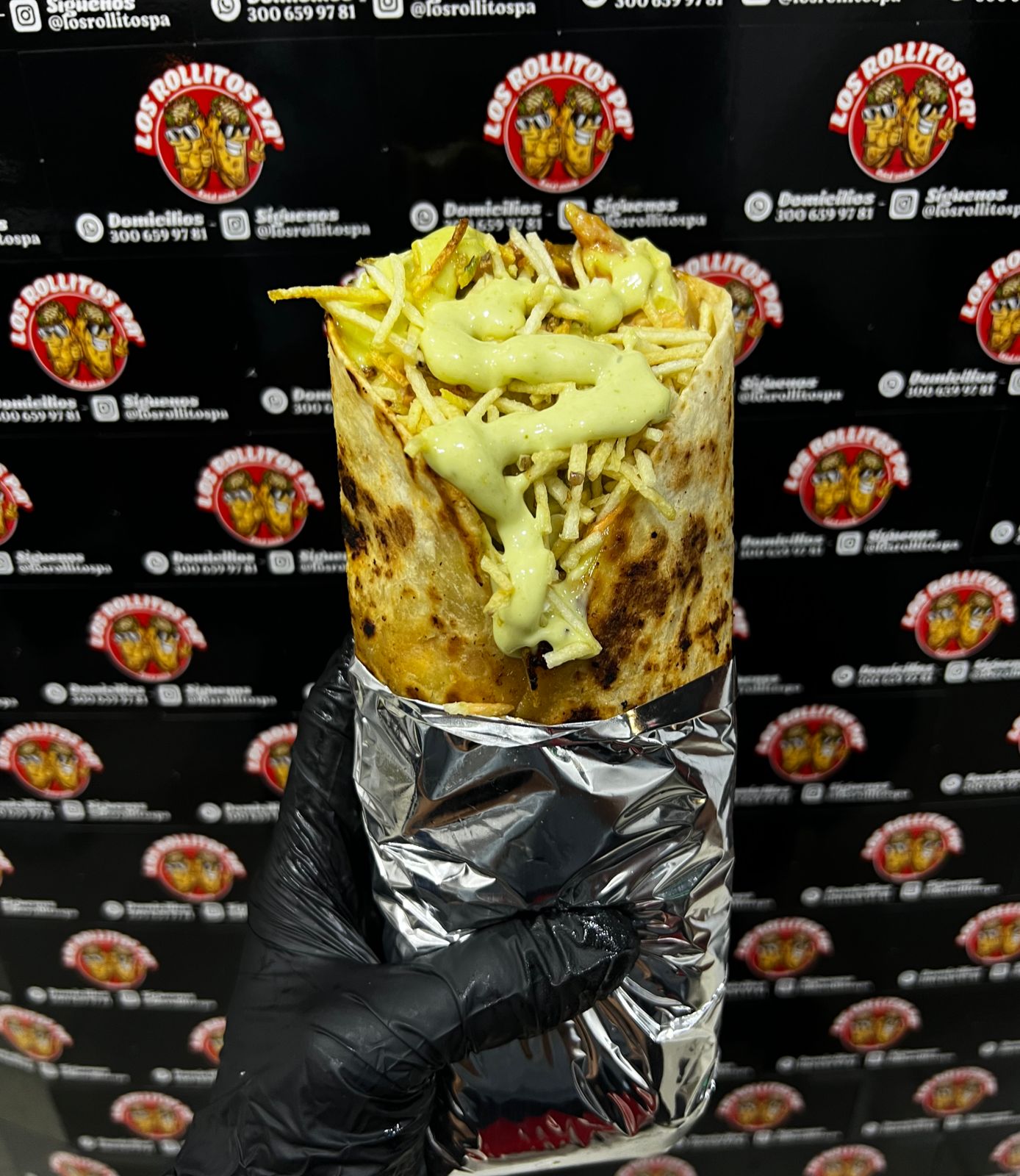 Rollito de 15cm con Trozos de Carne, pollo, tocineta, salchicha Ranchera, maíz, queso, lechuga, papas ripio y salsas.