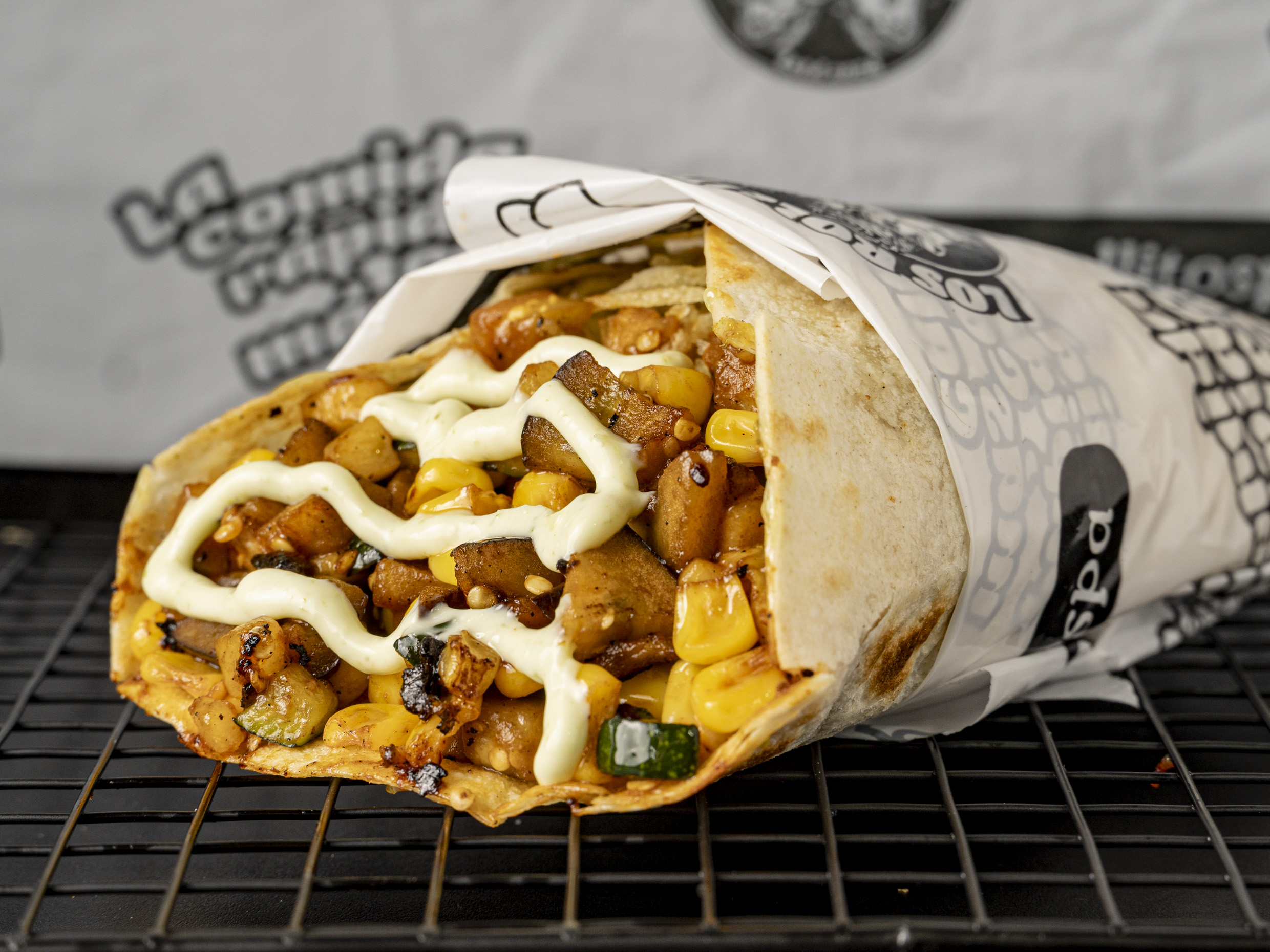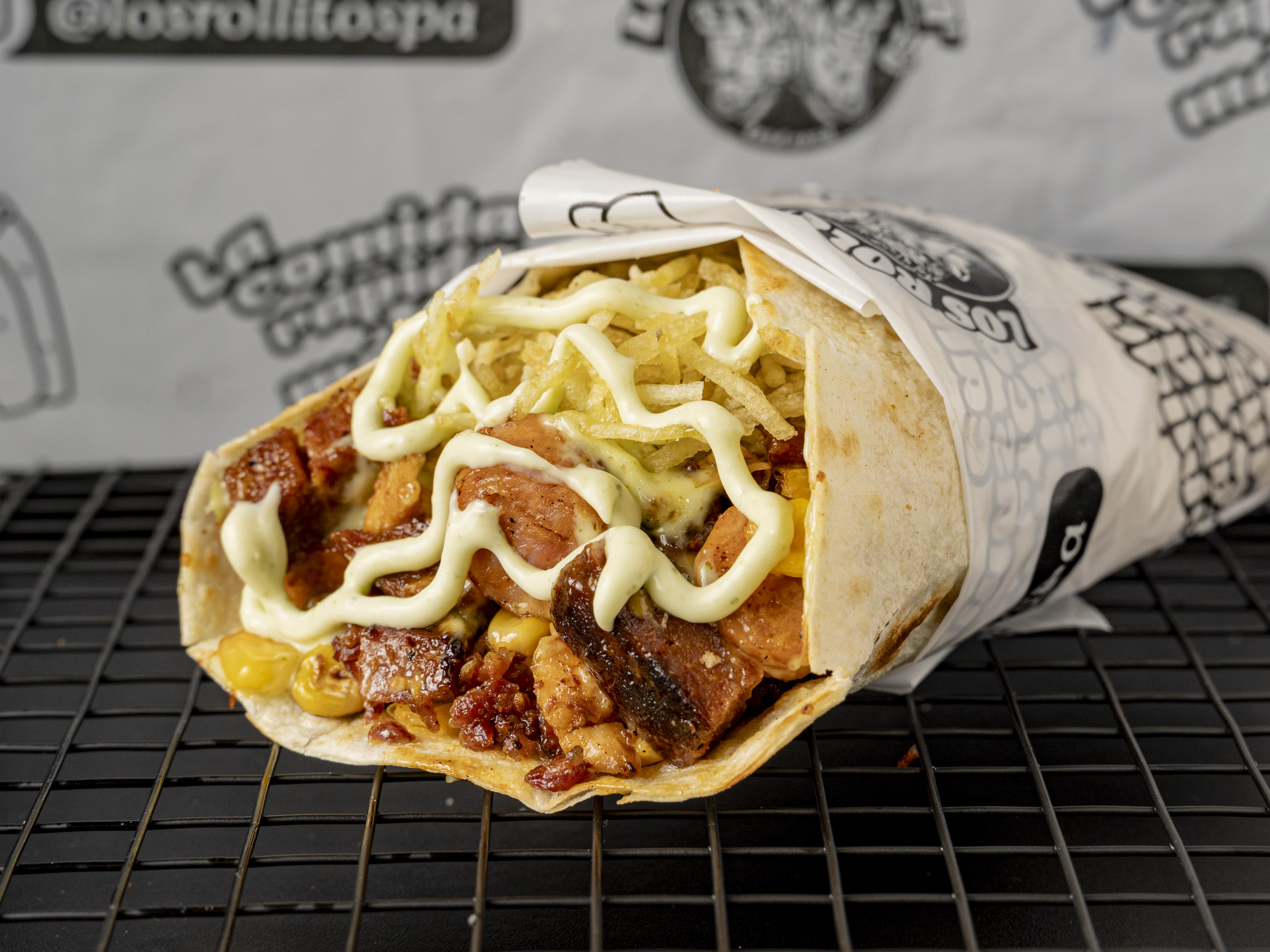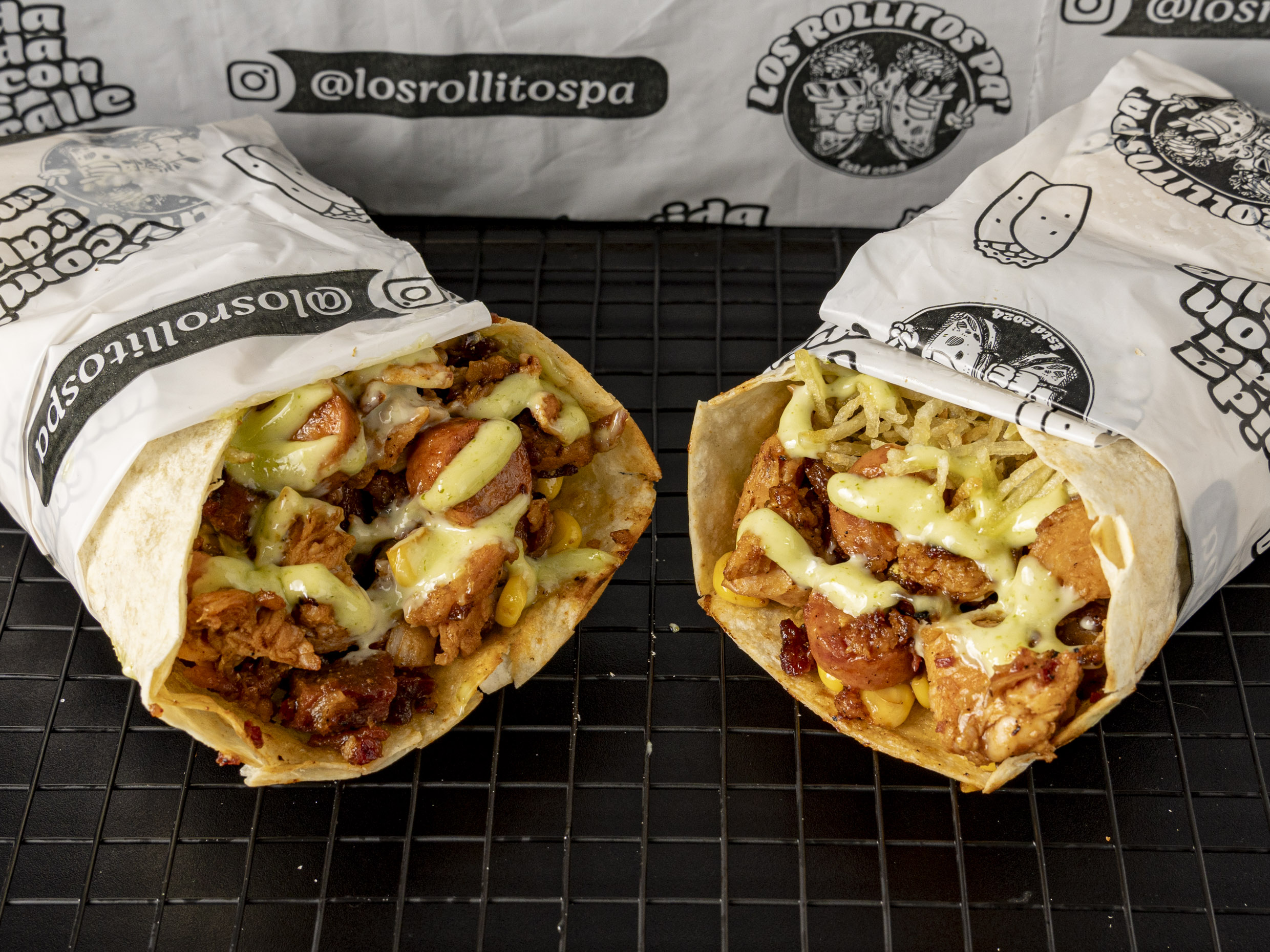 Carne, pollo, tocineta, salch. Ranchera, maíz, queso, veg, ripio. (Dos rollos tamaño intermedio entre el rollito y el rollote).