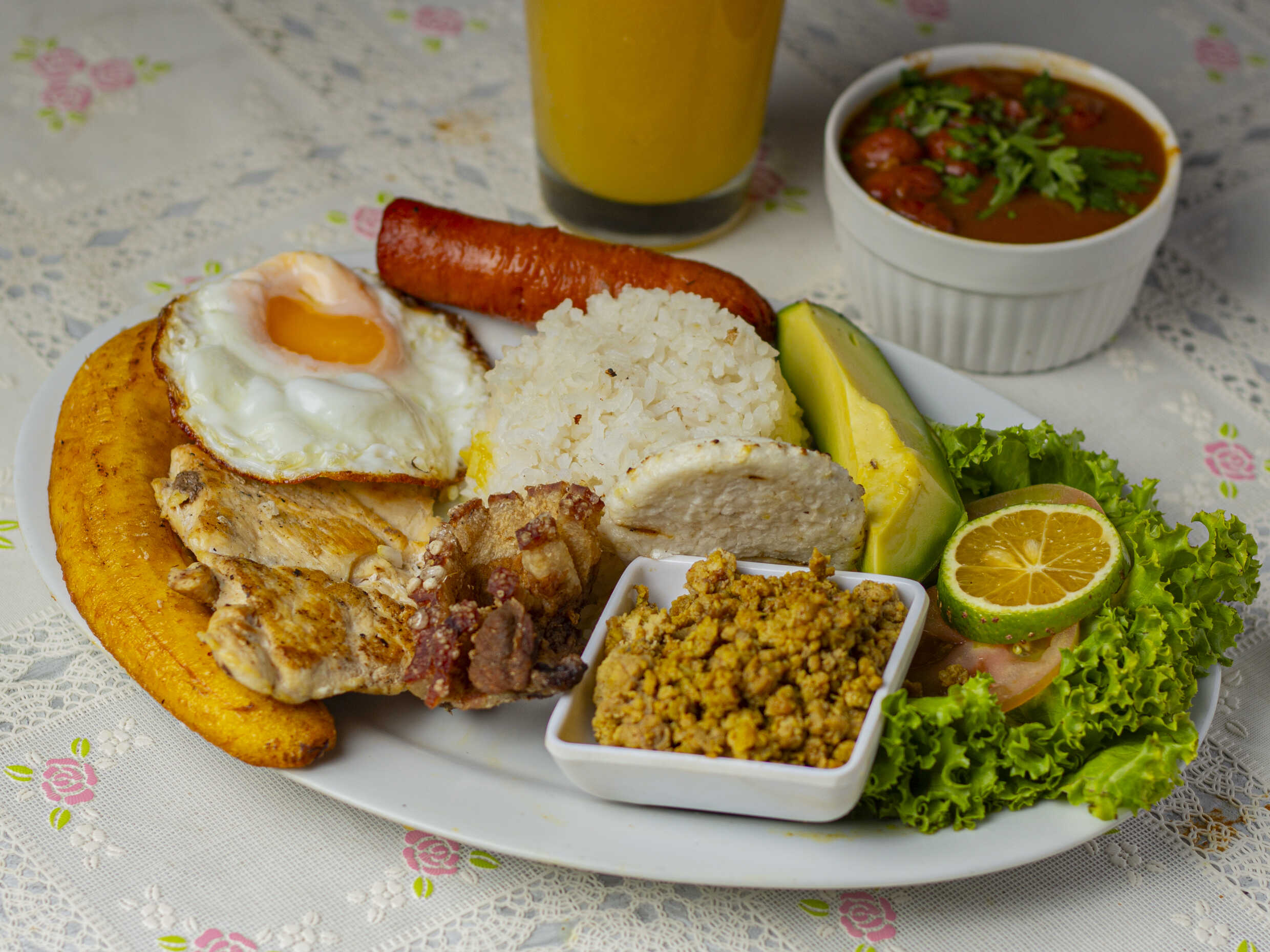Bandeja con arroz, chicharrón, carne molida, tajada de maduro, aguacate, frijoles, huevo y chorizo.