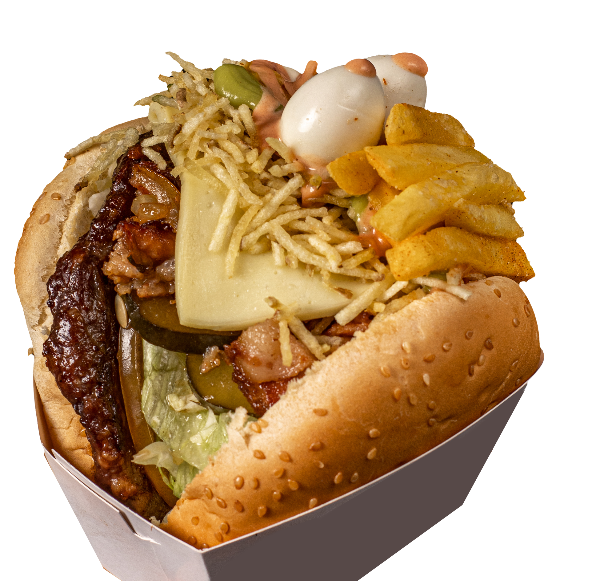 Pan, carne de hamburguesa de 120 gr., tomate, lechuga, ensalada, pepinillo dulce, queso mozzarella, ripio de papa, huevos de codorniz, papas a la francesa, tocineta, salsas y cebolla (opcional).