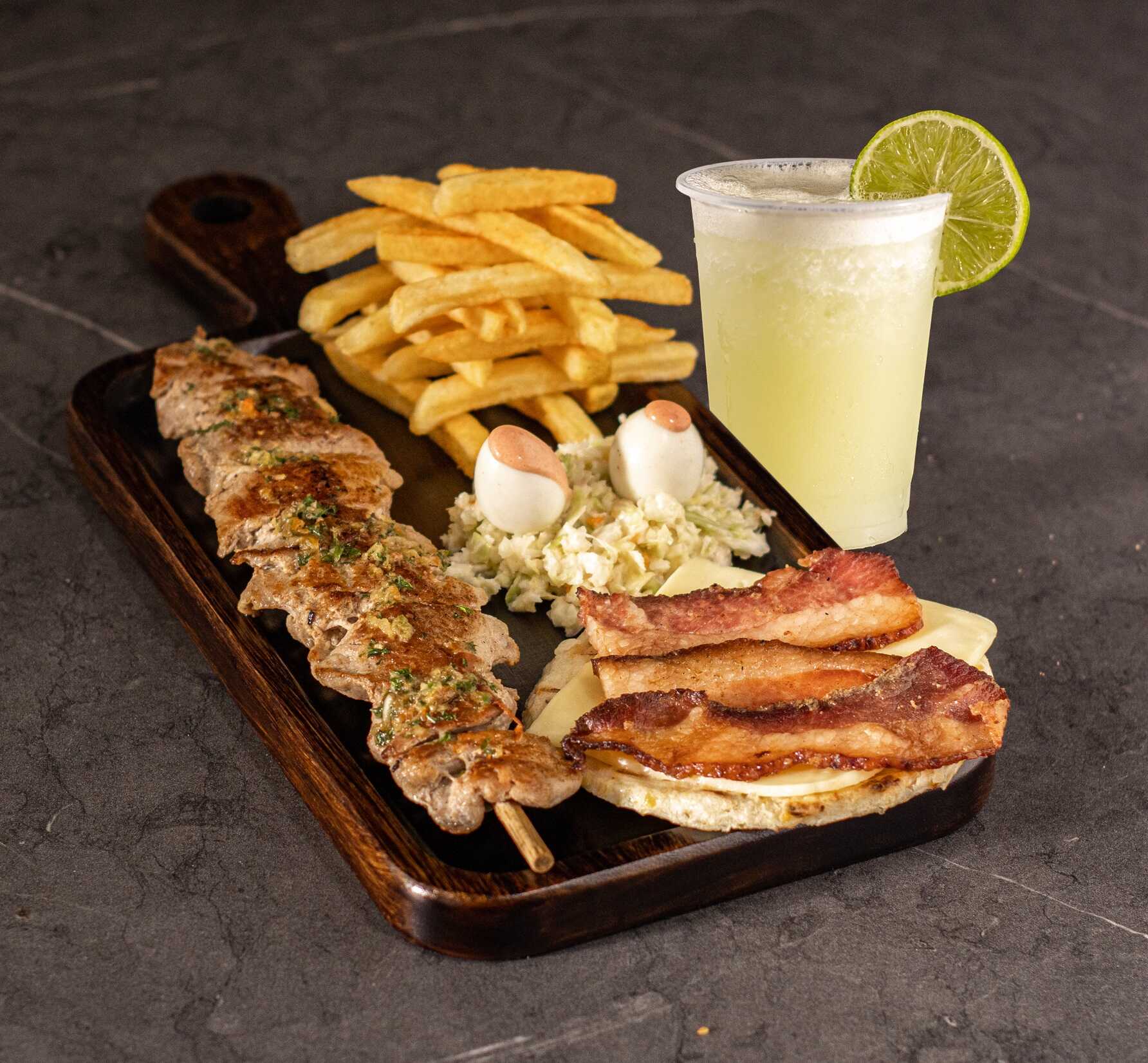 Chuzo de proteína a elección, papas francesas, arepa, queso mozzarella, tocineta, huevos de codorniz y ensalada + Limonada Natural