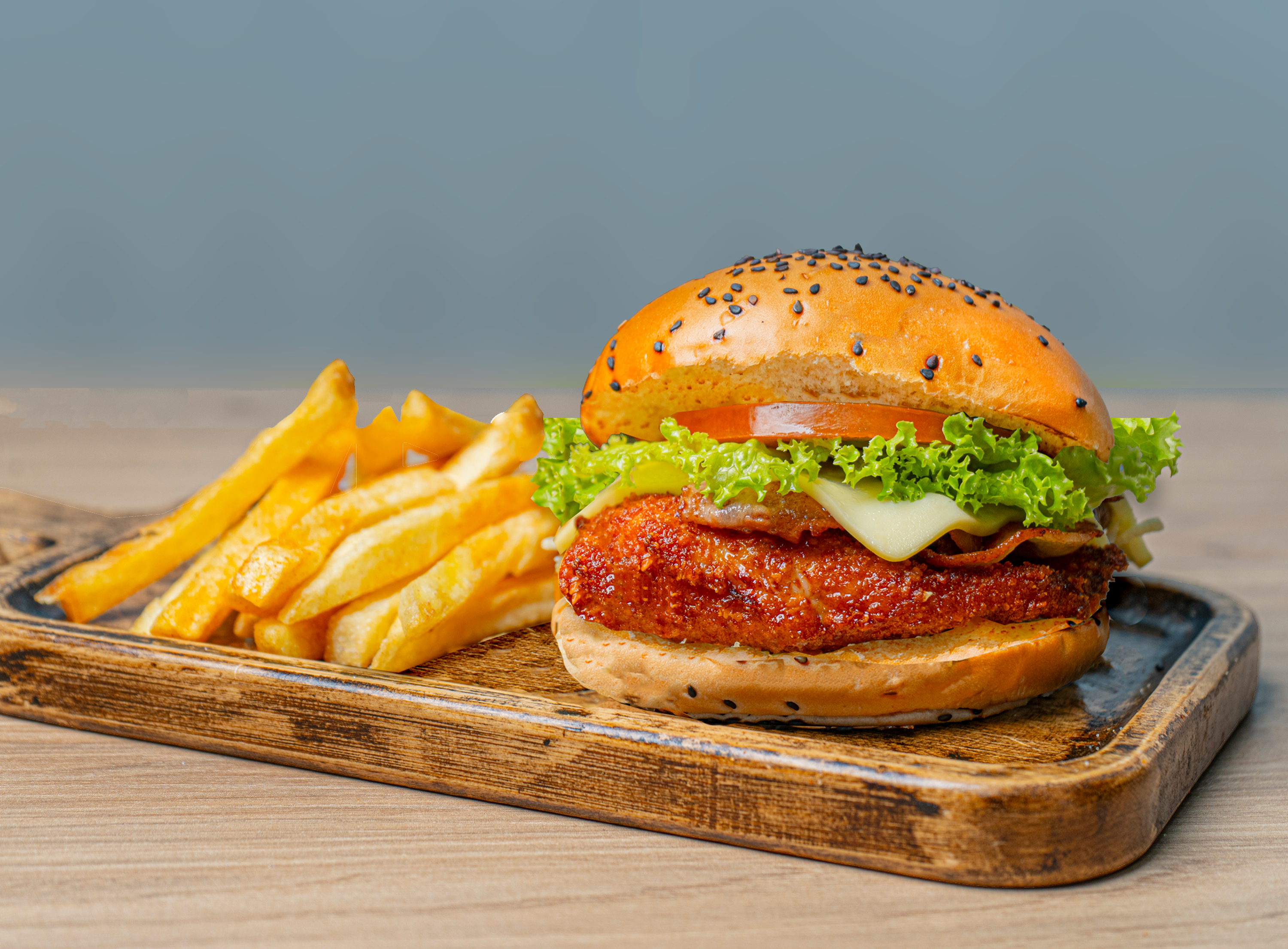 pan, pechuga apanada, tocineta, ensalada, tomate, lechuga, pepinillo dulce, queso mozzarella, ripio de papa, huevo de codorniz y salsas