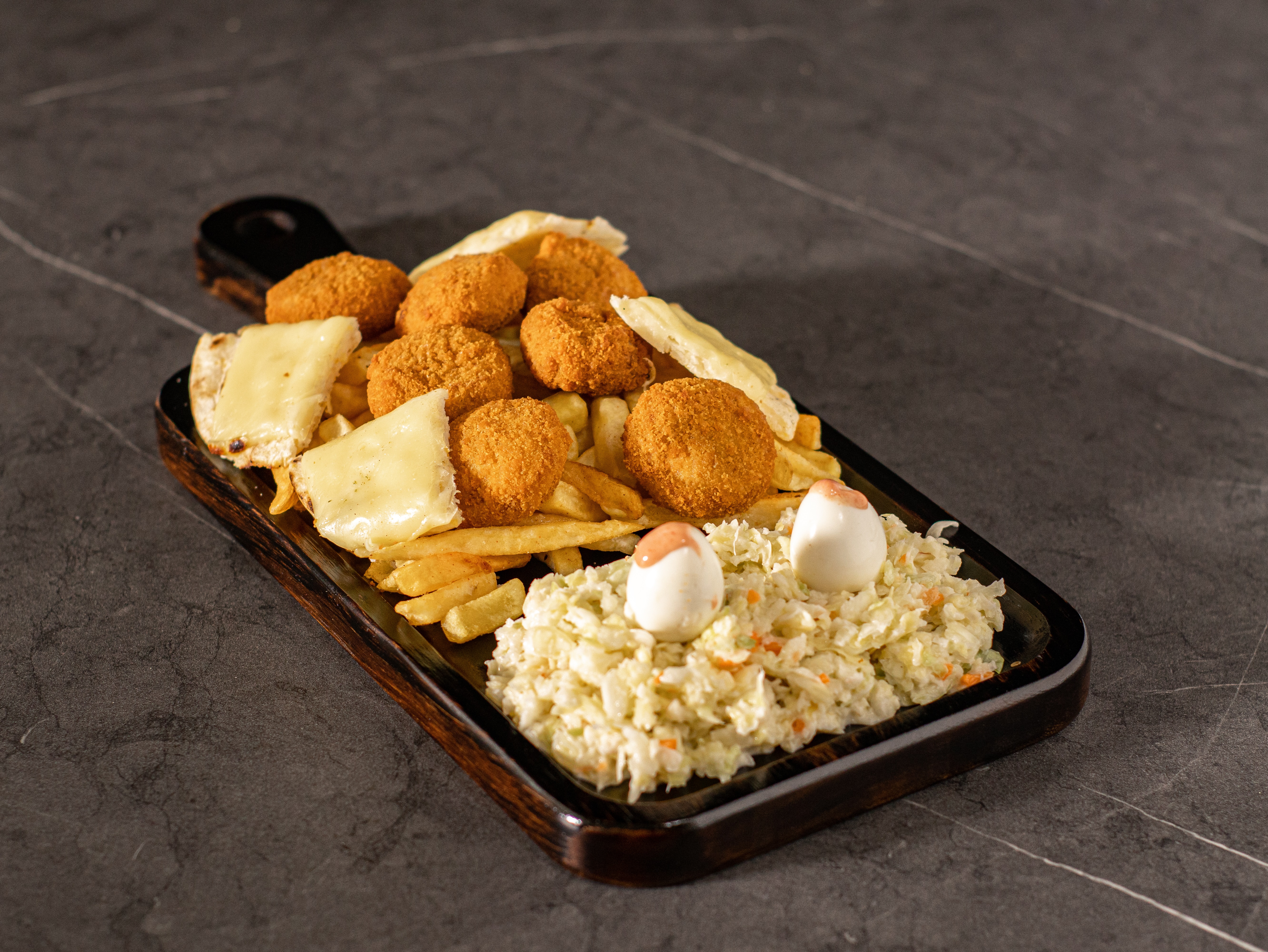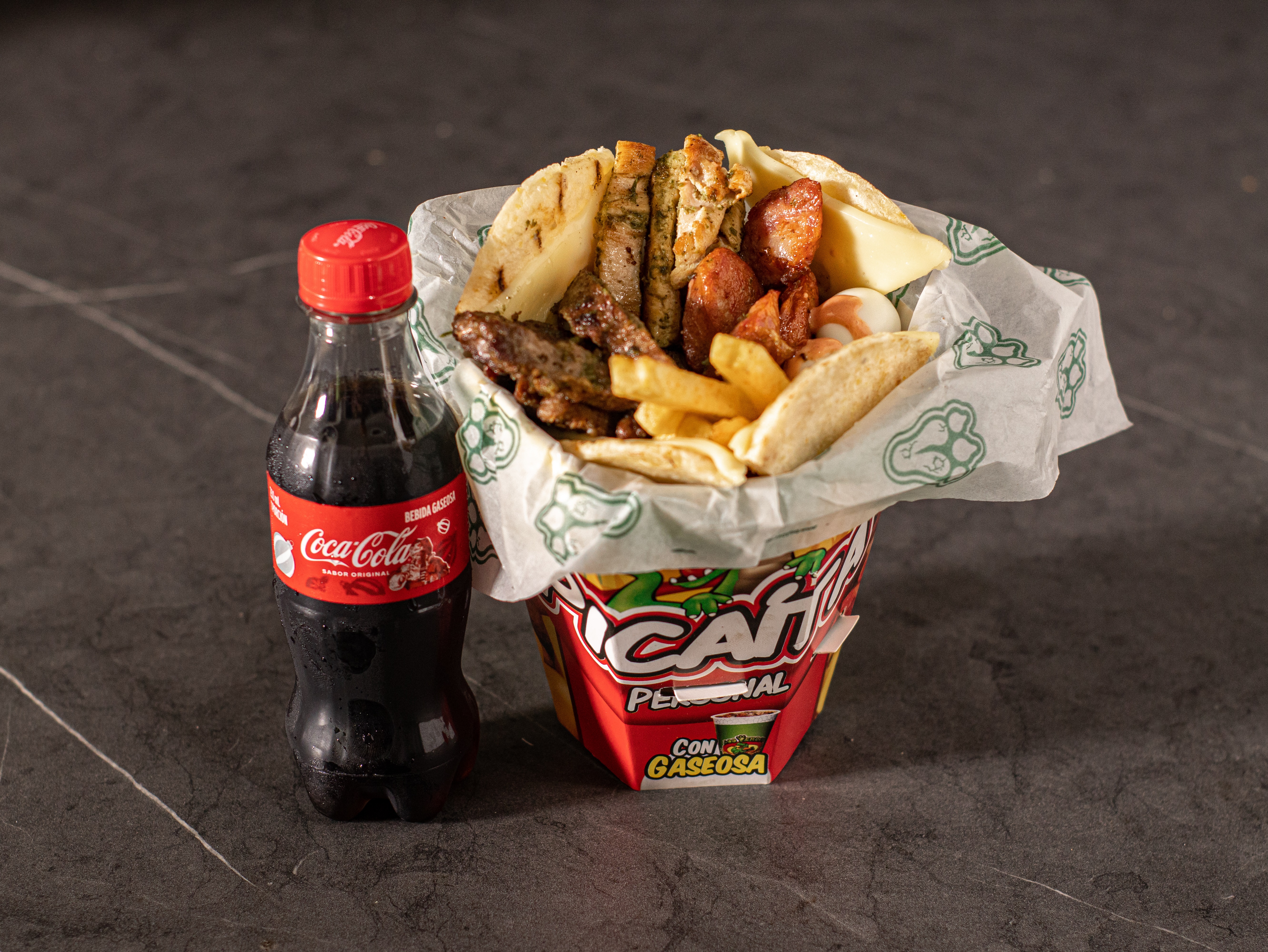 Papas a la francesa, chorizo longaniza, salchichas, pechuga, cañon, queso costeño, ripio de papa, queso mozzarella, maíz dulce, tocineta y salsas de la casa