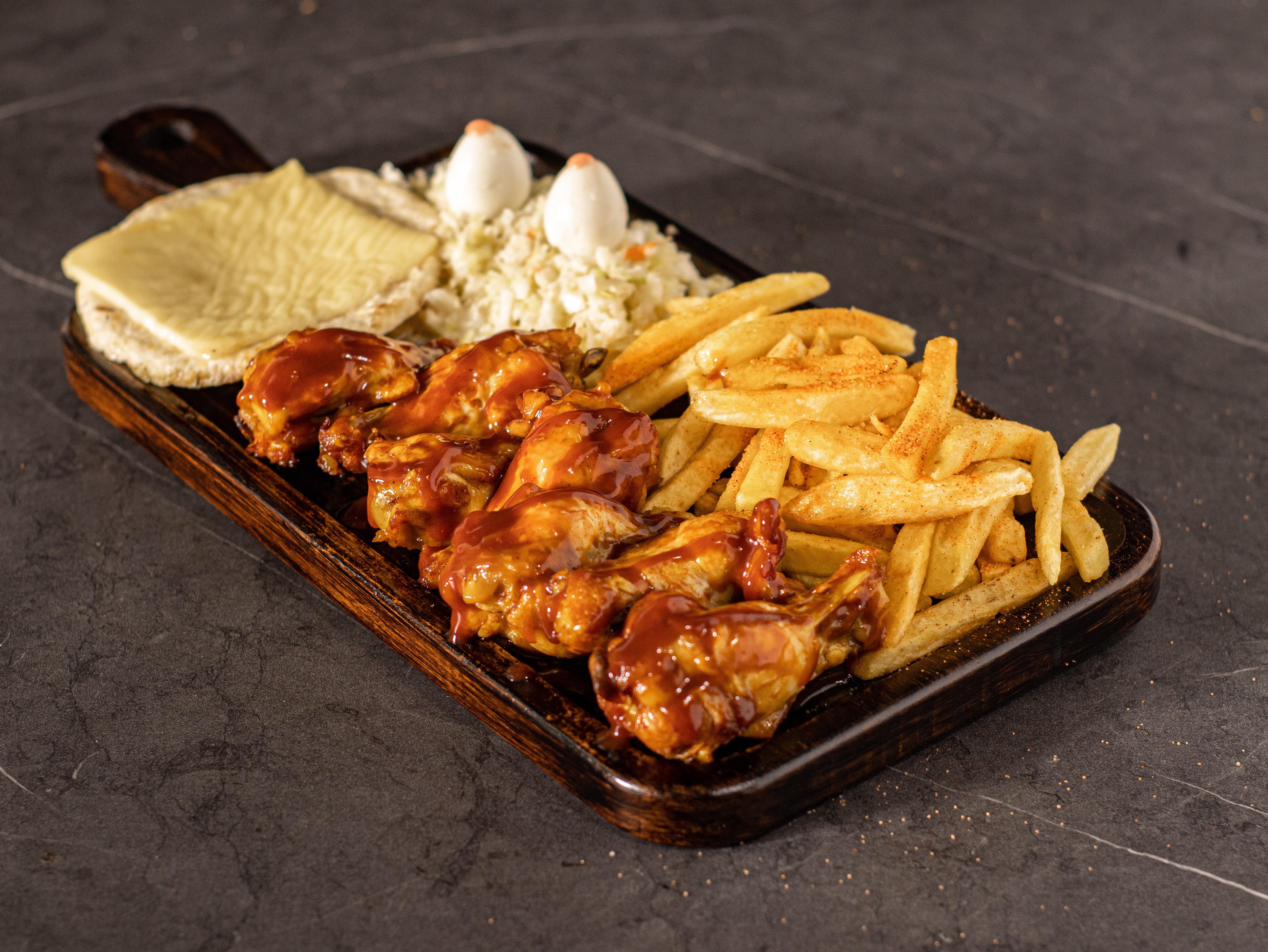 Carne de cerdo, longaniza, chorizo, salchichas, carne de hamburguesa, chicharrón ahumado, arepa, queso mozzarella, papas a la francesa, tomate, ensalada, huevos de codorniz y salsa BBQ.