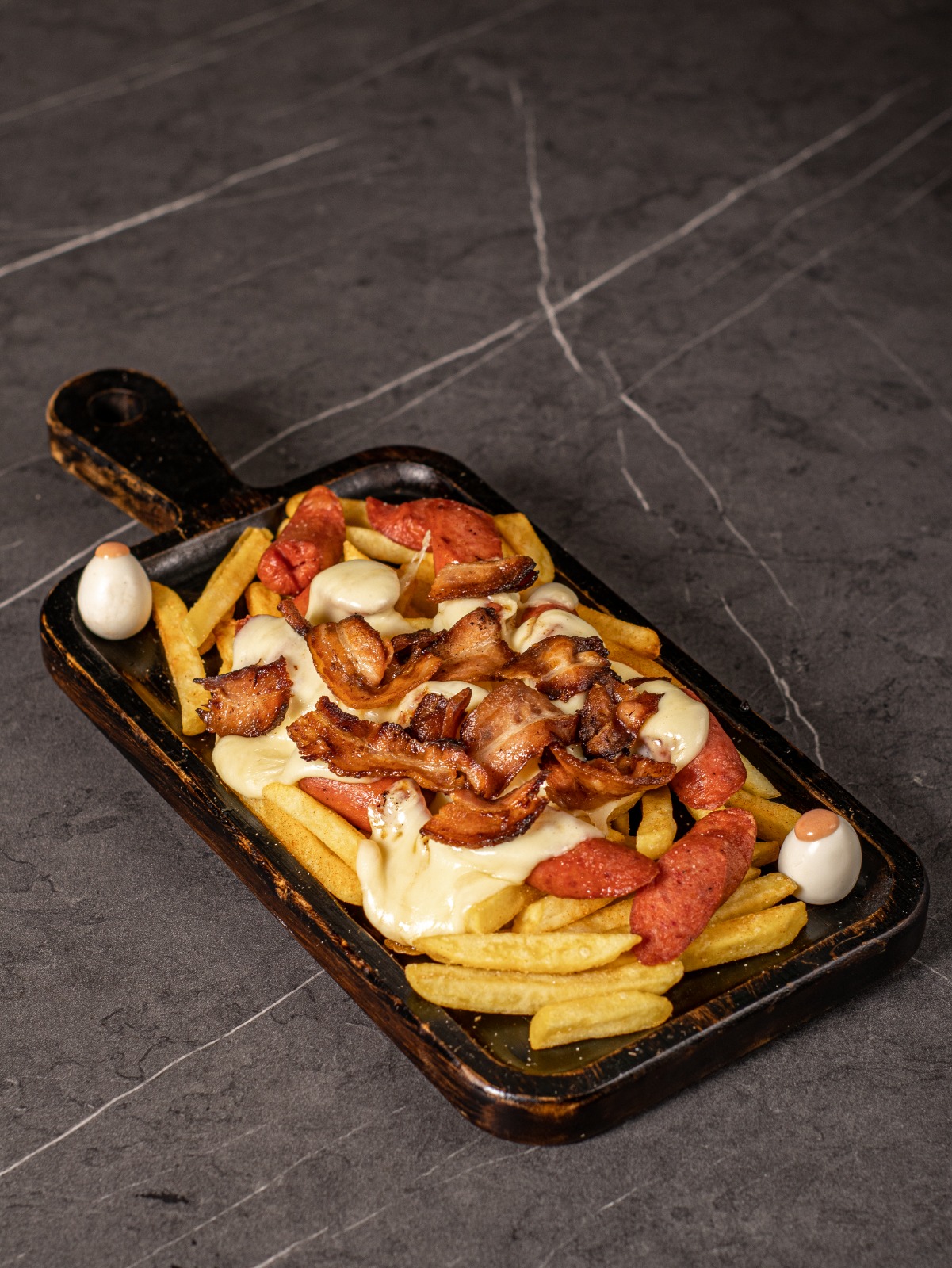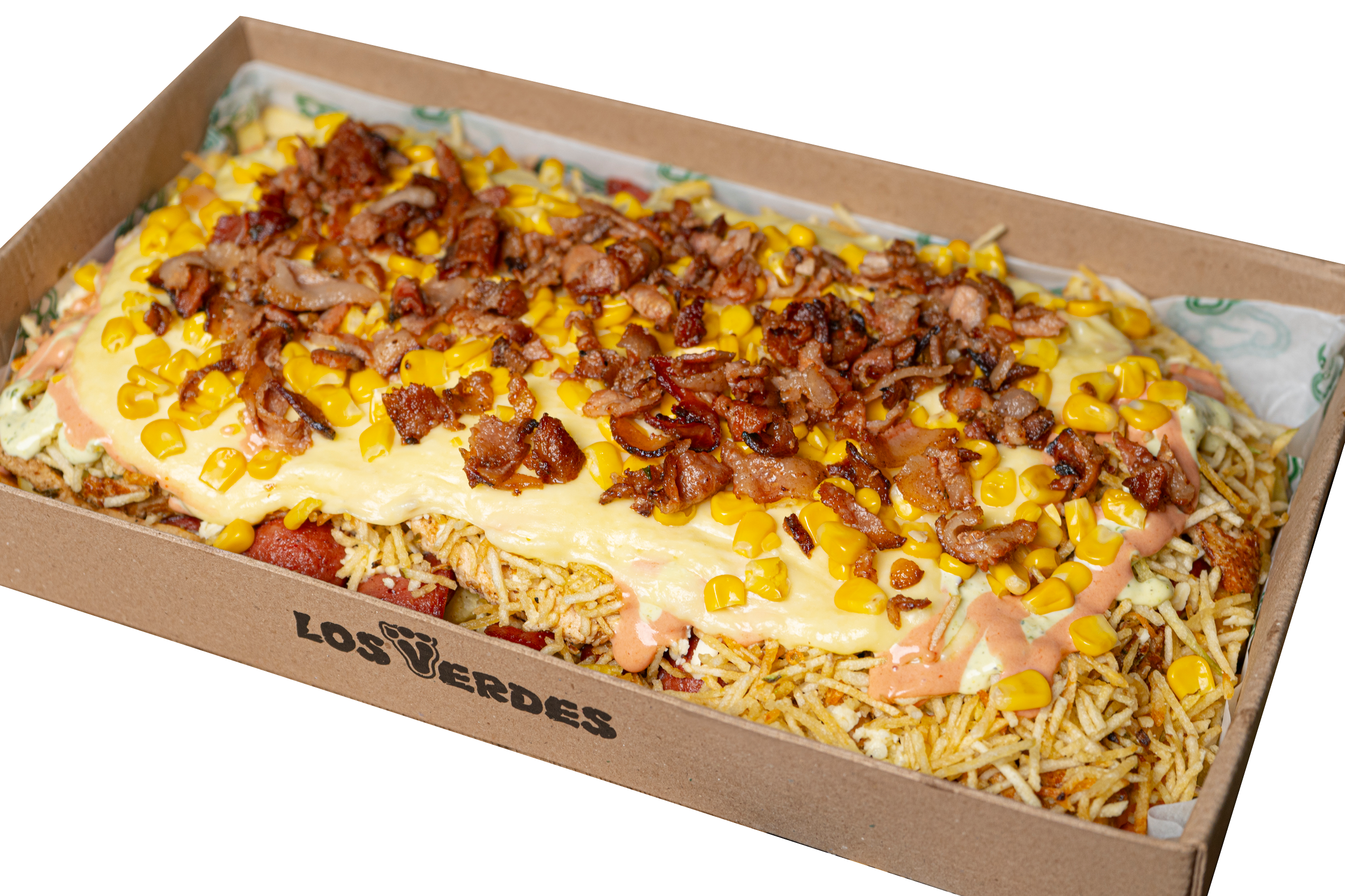 Papas a la francesa, frijol con chili no picante, chorizo, abundante tocineta, salsa de queso, guacamole y salsa ranch.