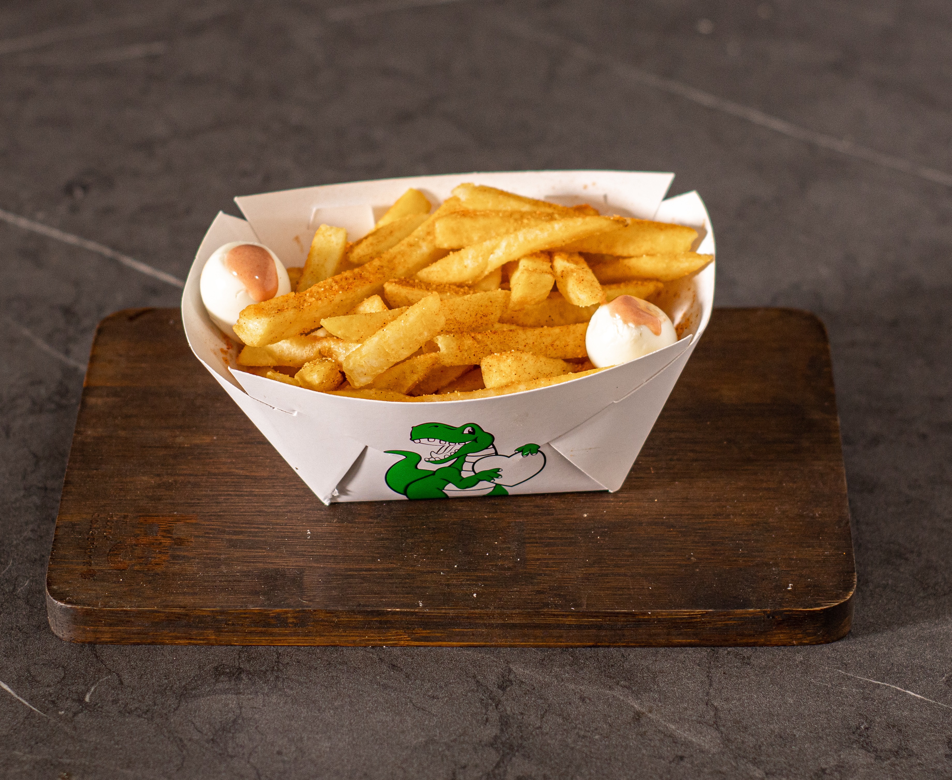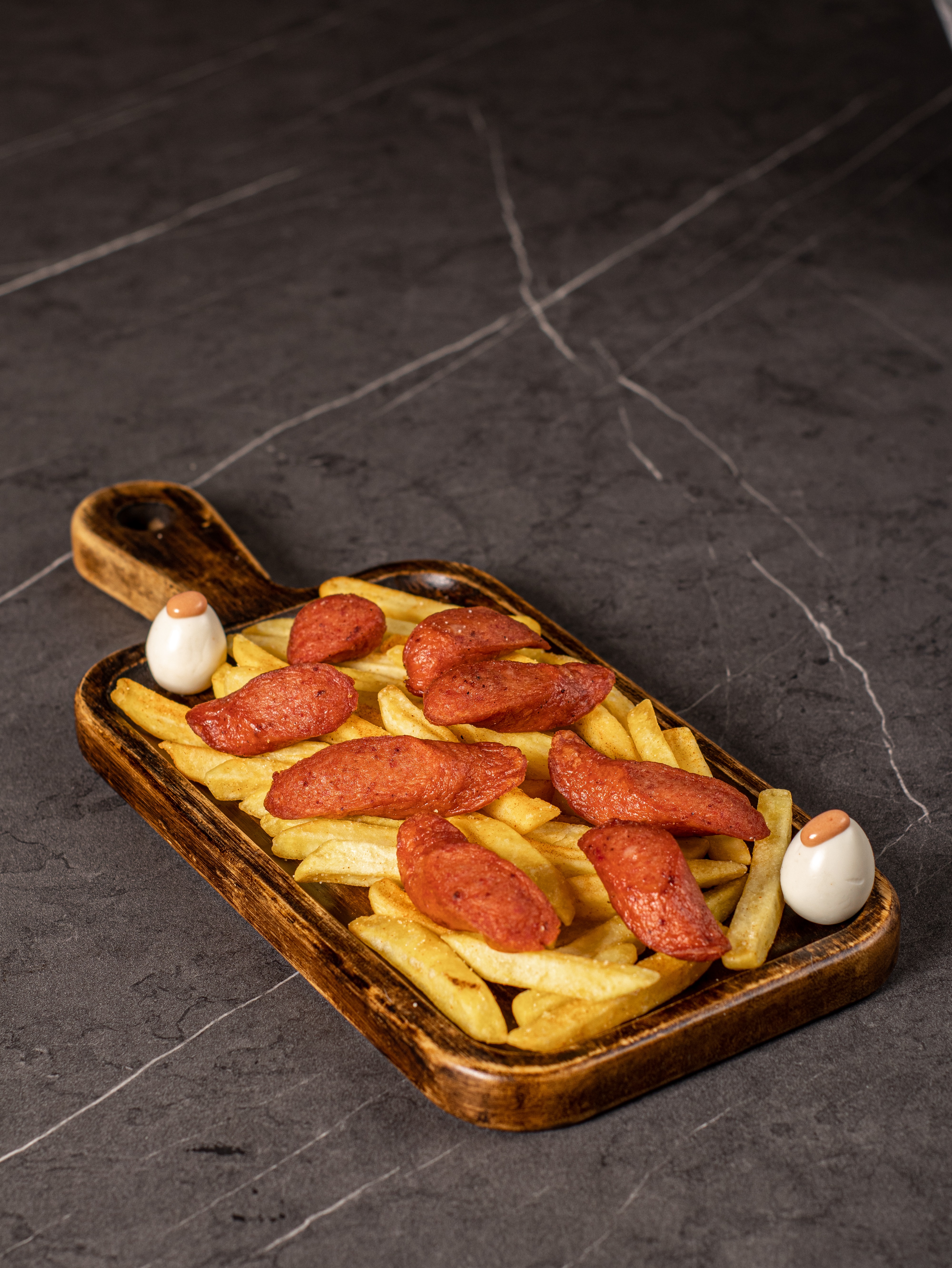 Papas a la francesa, salchichas, huevos de codorniz, queso mozzarella y tocineta