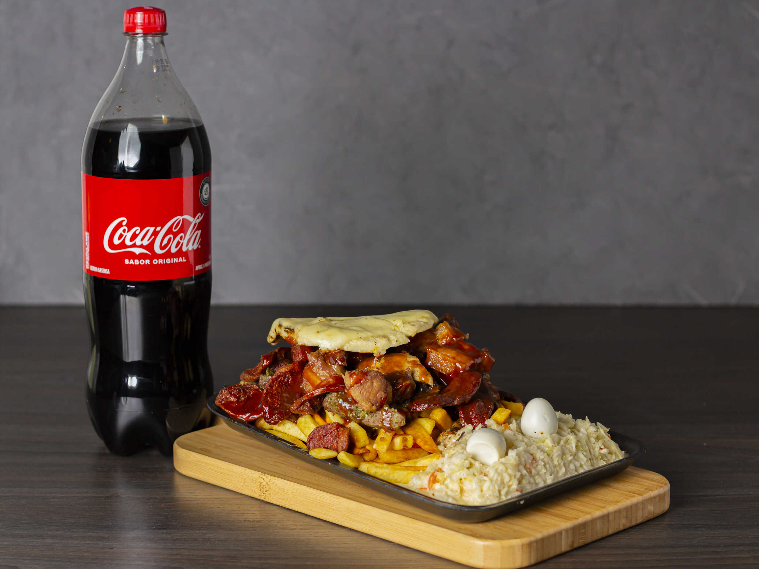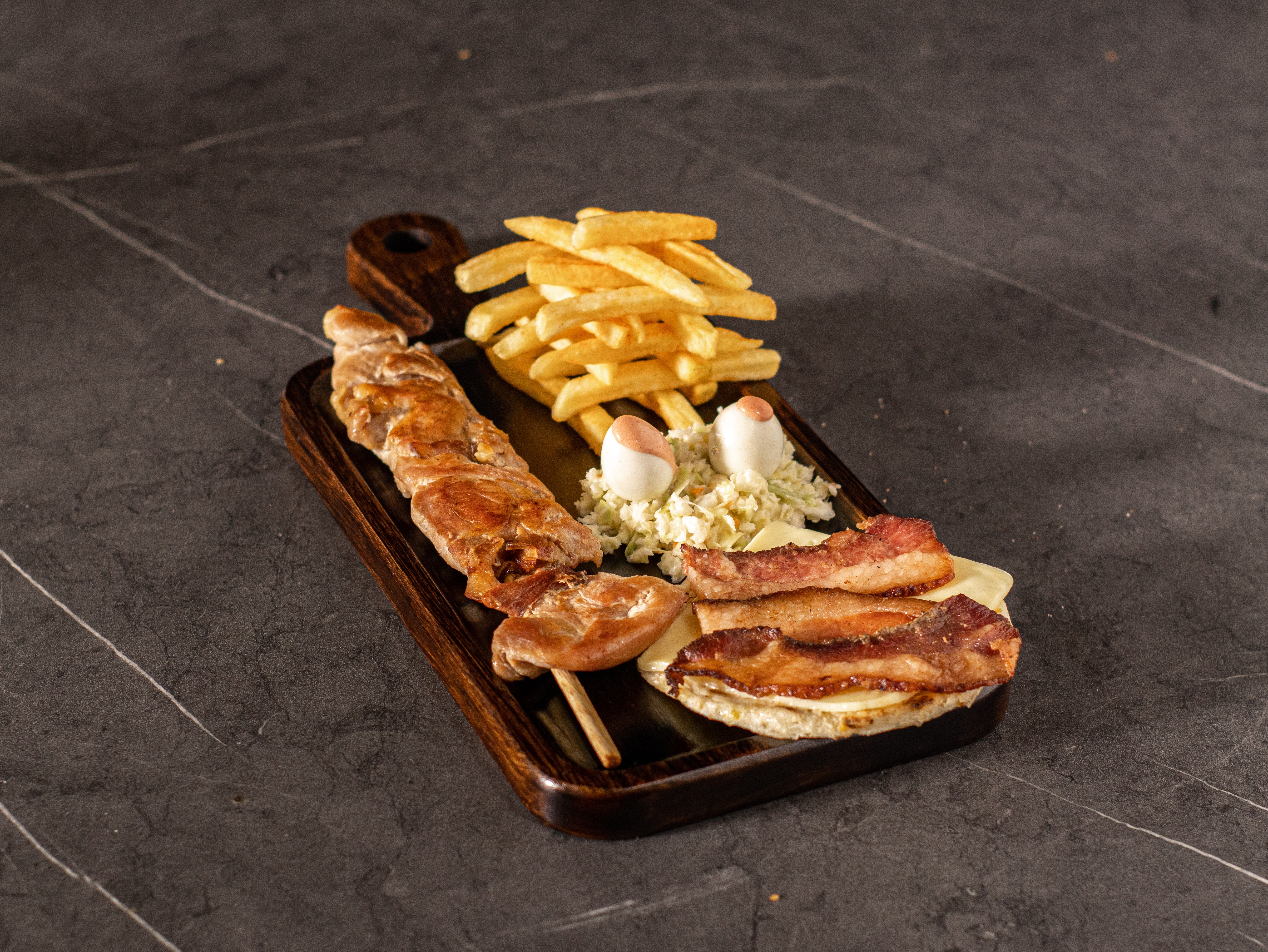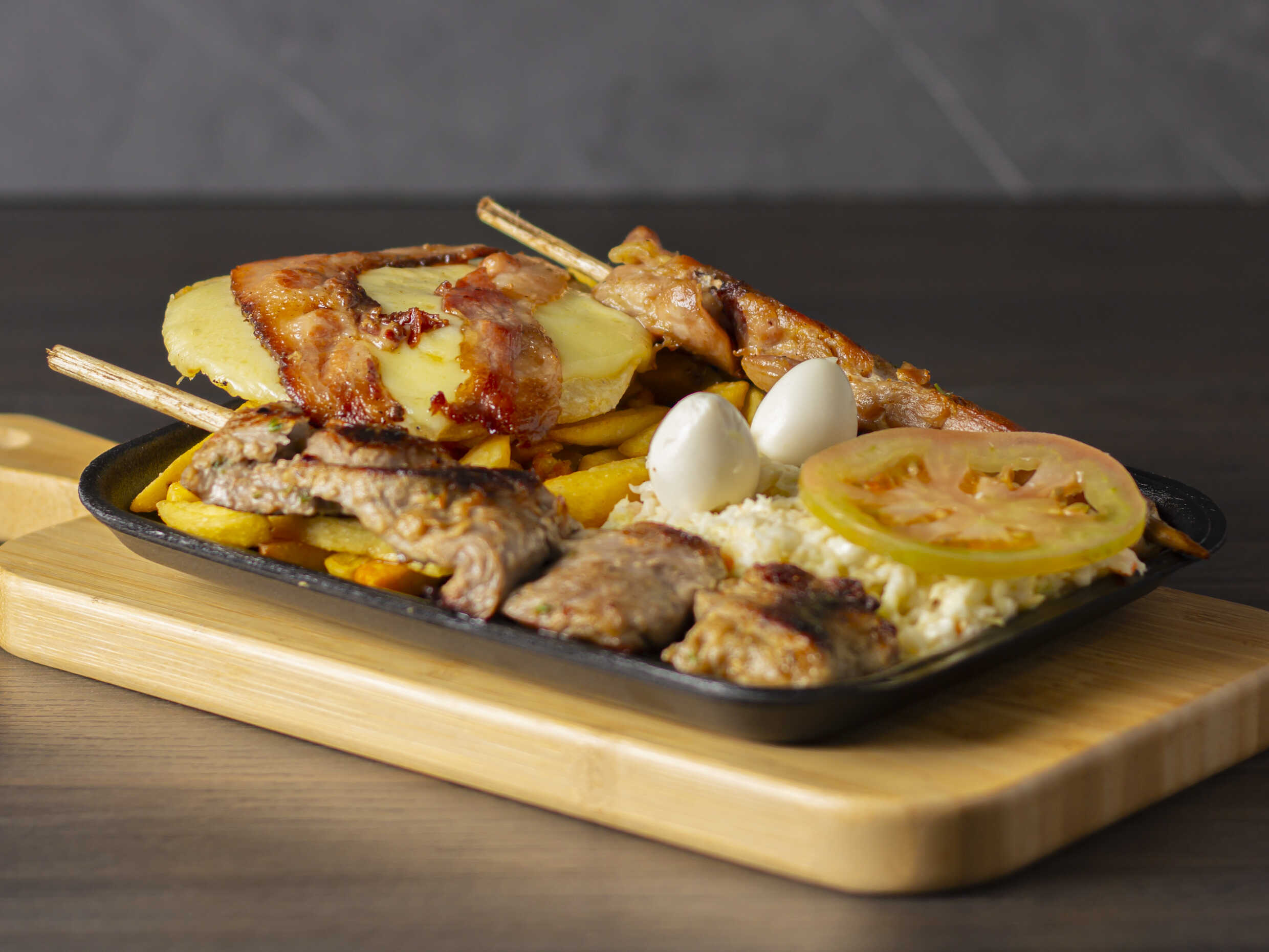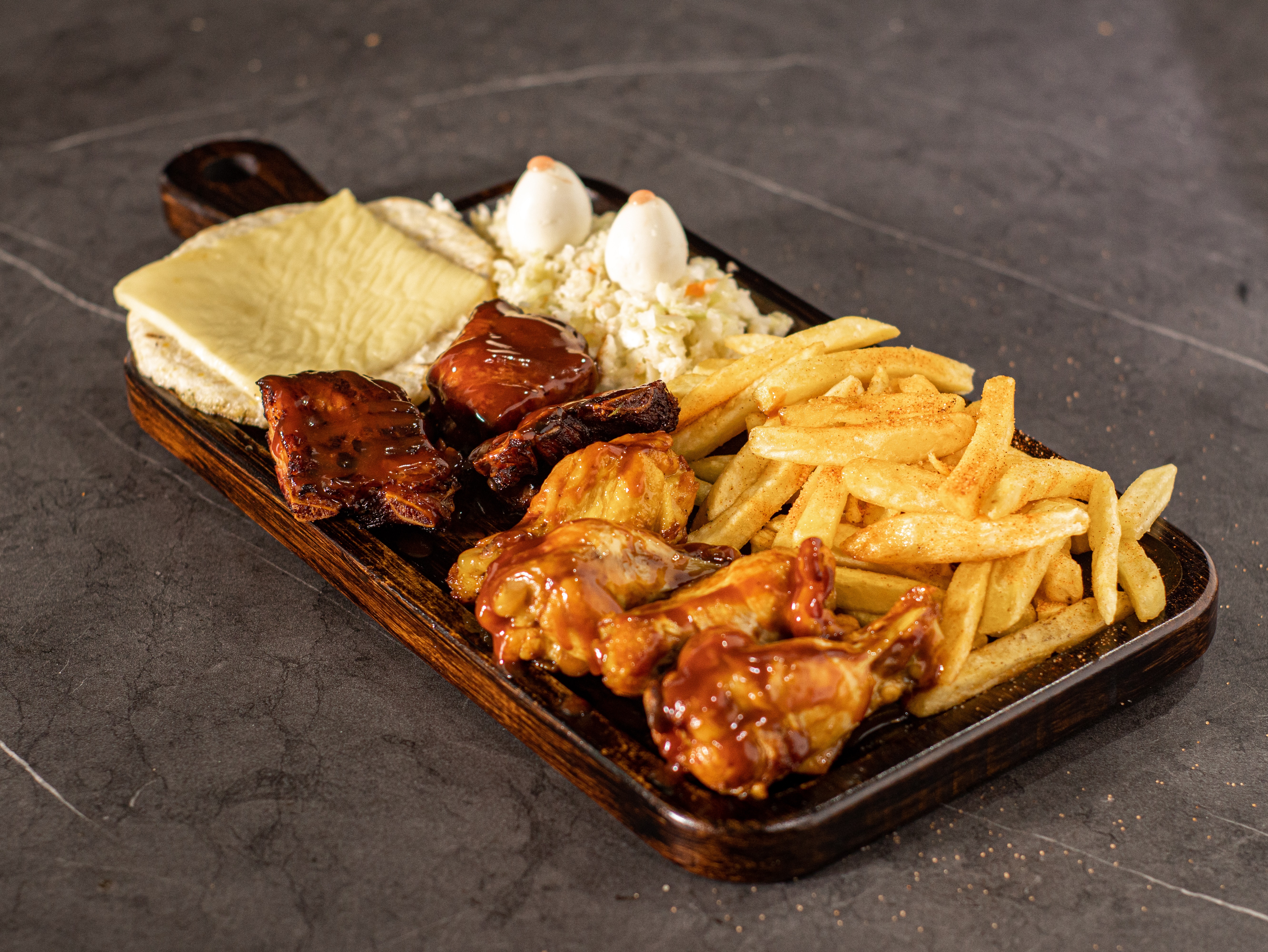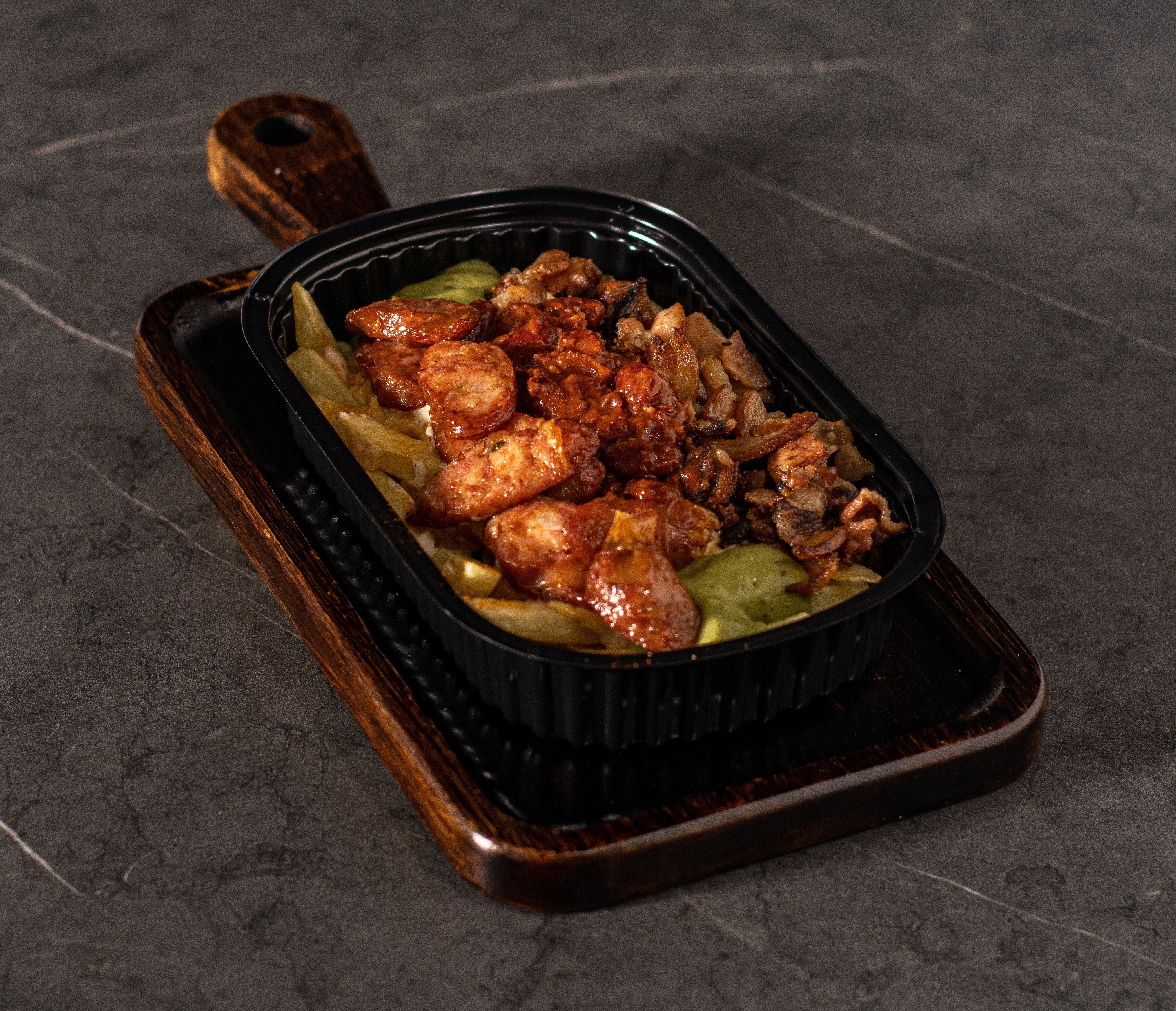 Carne de cerdo, longaniza, chorizo, salchichas, carne de hamburguesa, chicharrón ahumado, arepa, queso mozzarella, papas a la francesa, tomate, ensalada, huevos de codorniz y salsa BBQ.