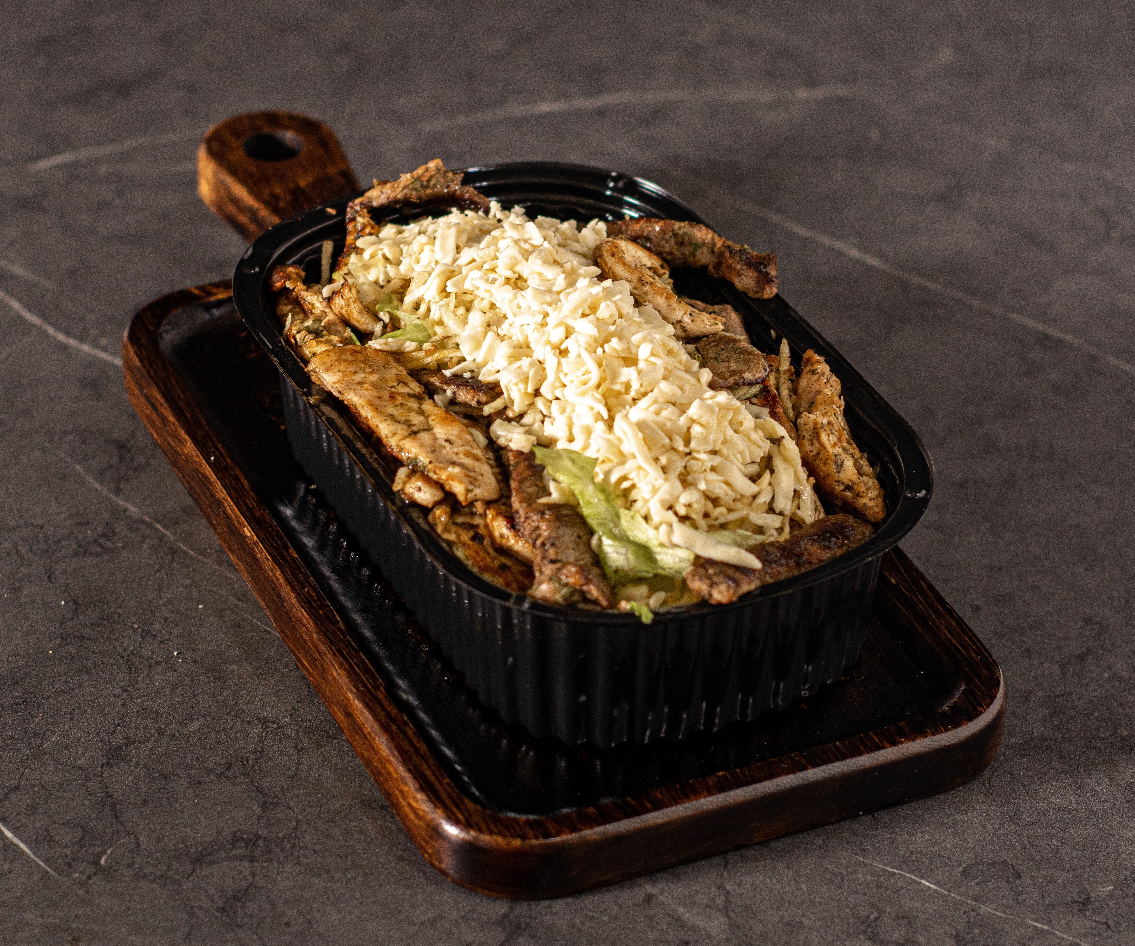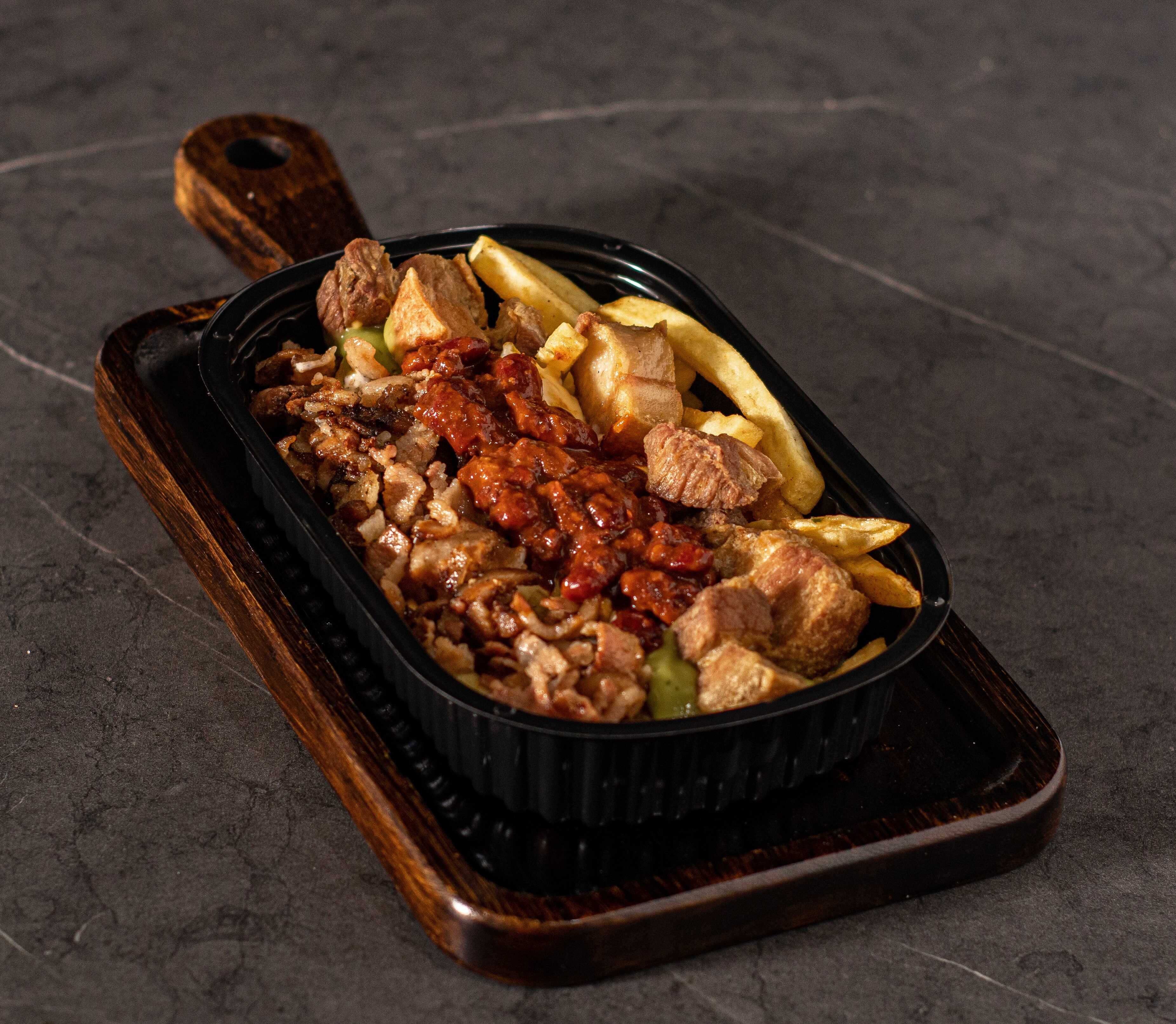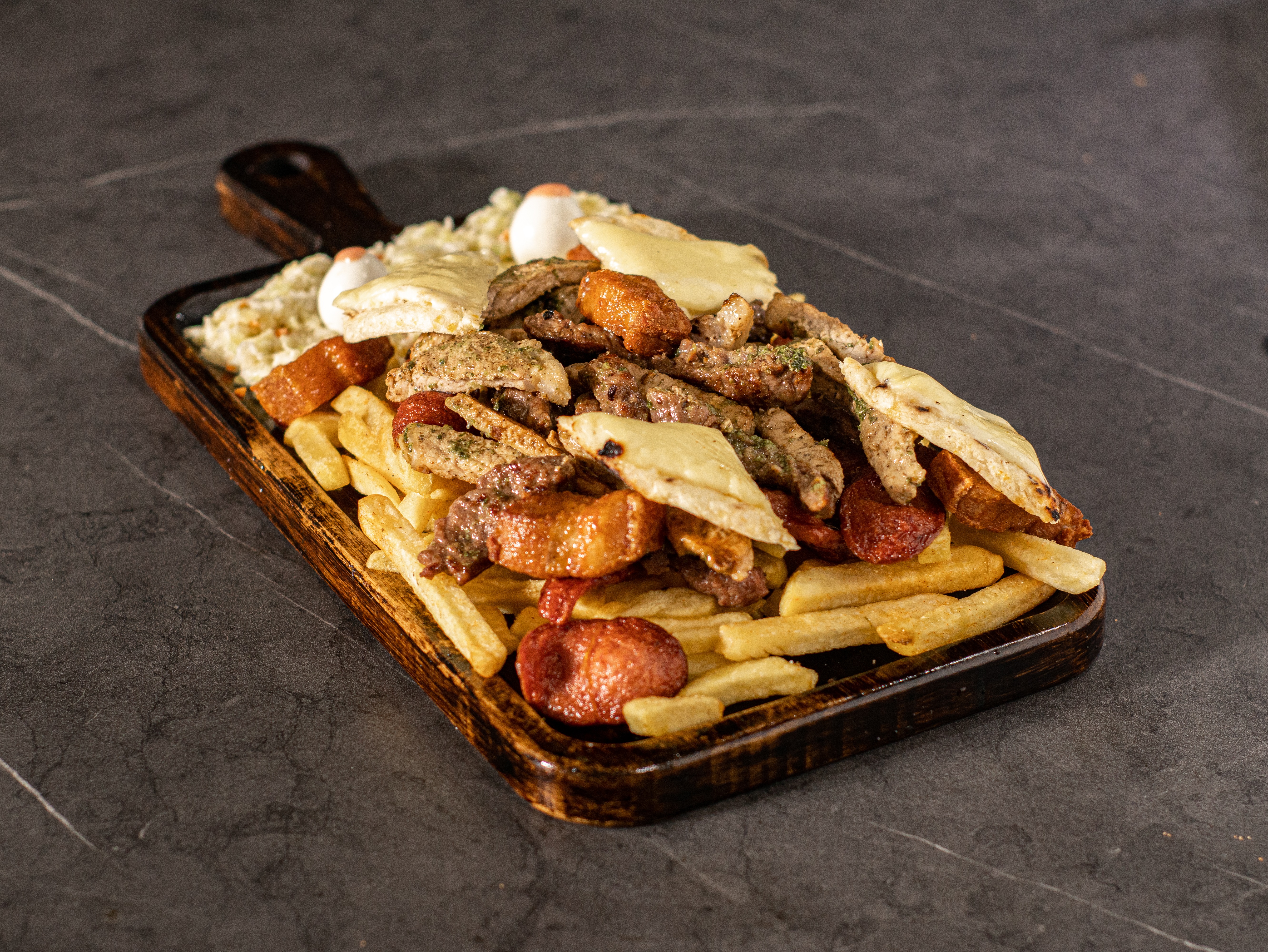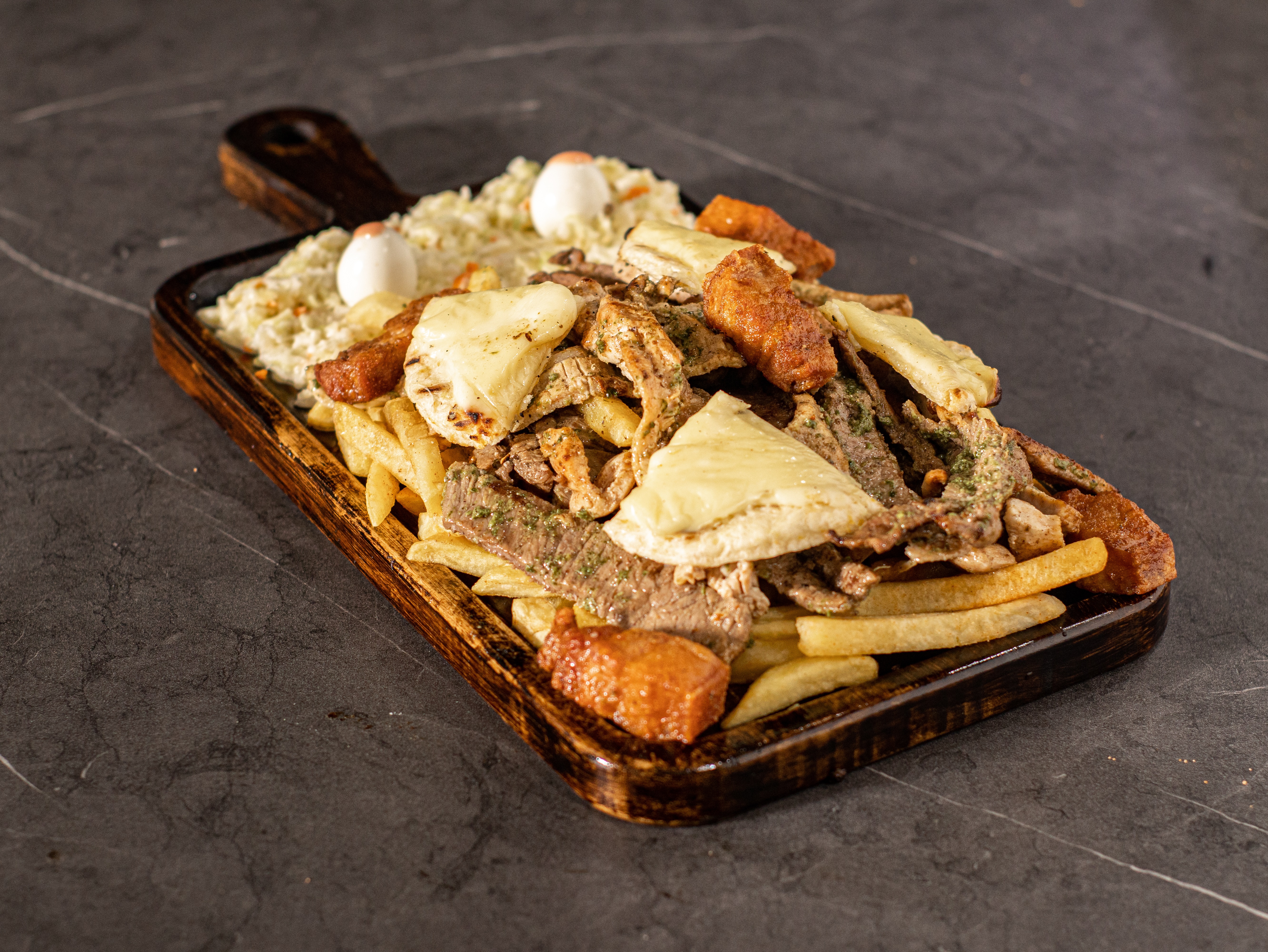 Papas a la francesa, chorizo longaniza, salchichas, pechuga, cañon, queso costeño, ripio de papa, queso mozzarella, maíz dulce, tocineta y salsas de la casa